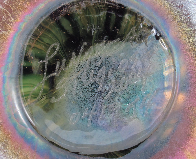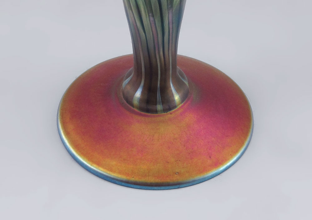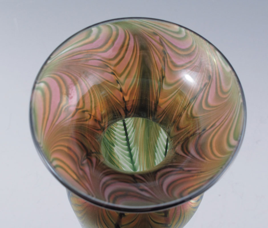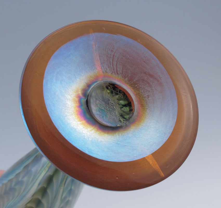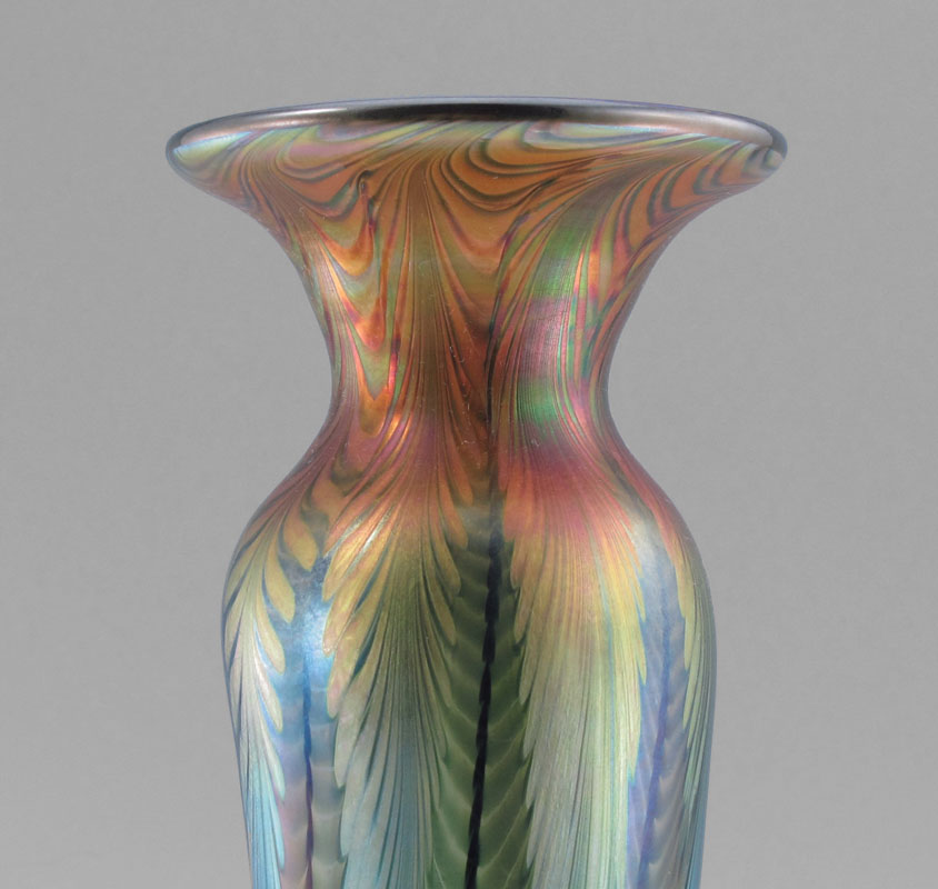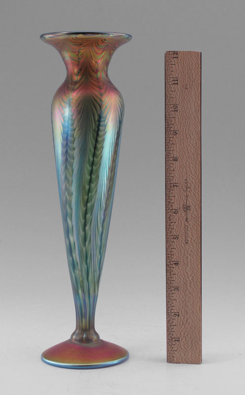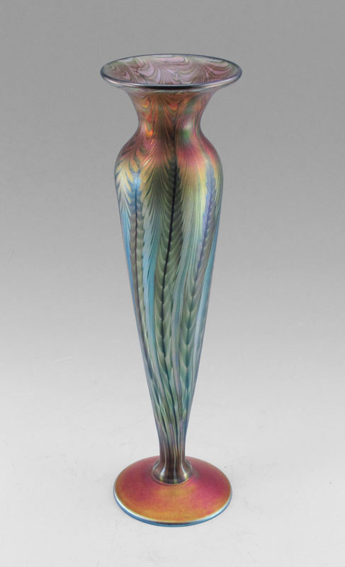 LUNDBERG STUDIOS IRIDESCENT ART GLASS VASE: Nice shading of gold iridescences at the shoulder and the base, central feather design in blue. Signed Lundberg Studios 041954, dated 2004. 12 3/4'' tall.