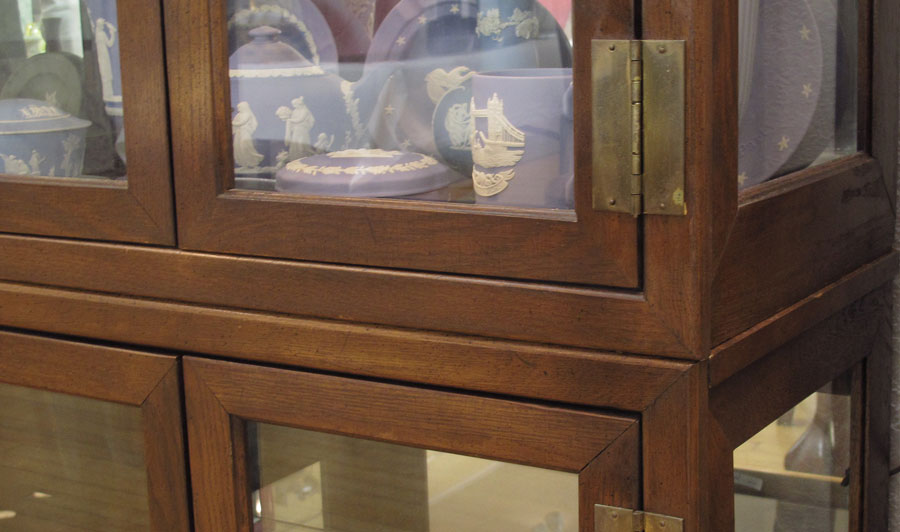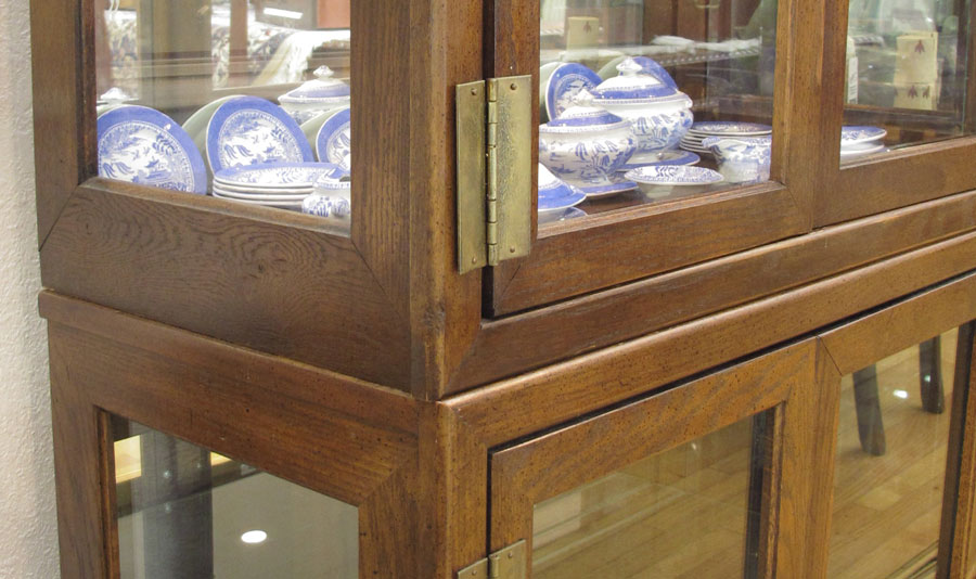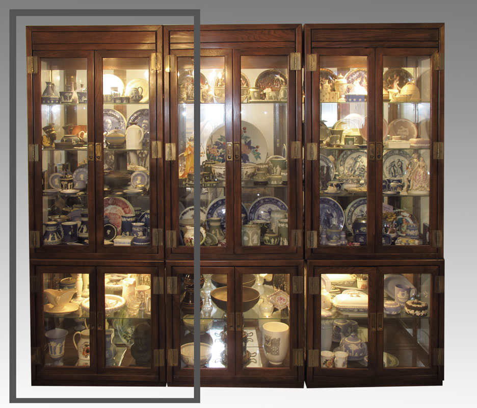 CONTEMPORARY CURIO DISPLAY CABINET: 2 part stacking cabinets, double doors, illuminated interior, glass shelves, with mirror back. 80'' x 30'' x 15'' deep.