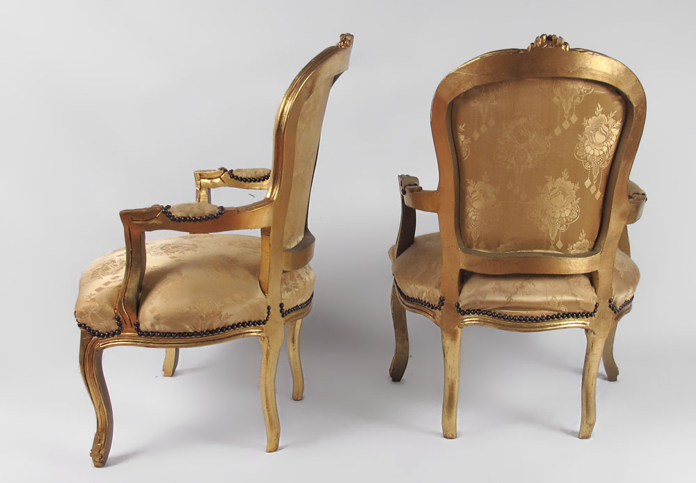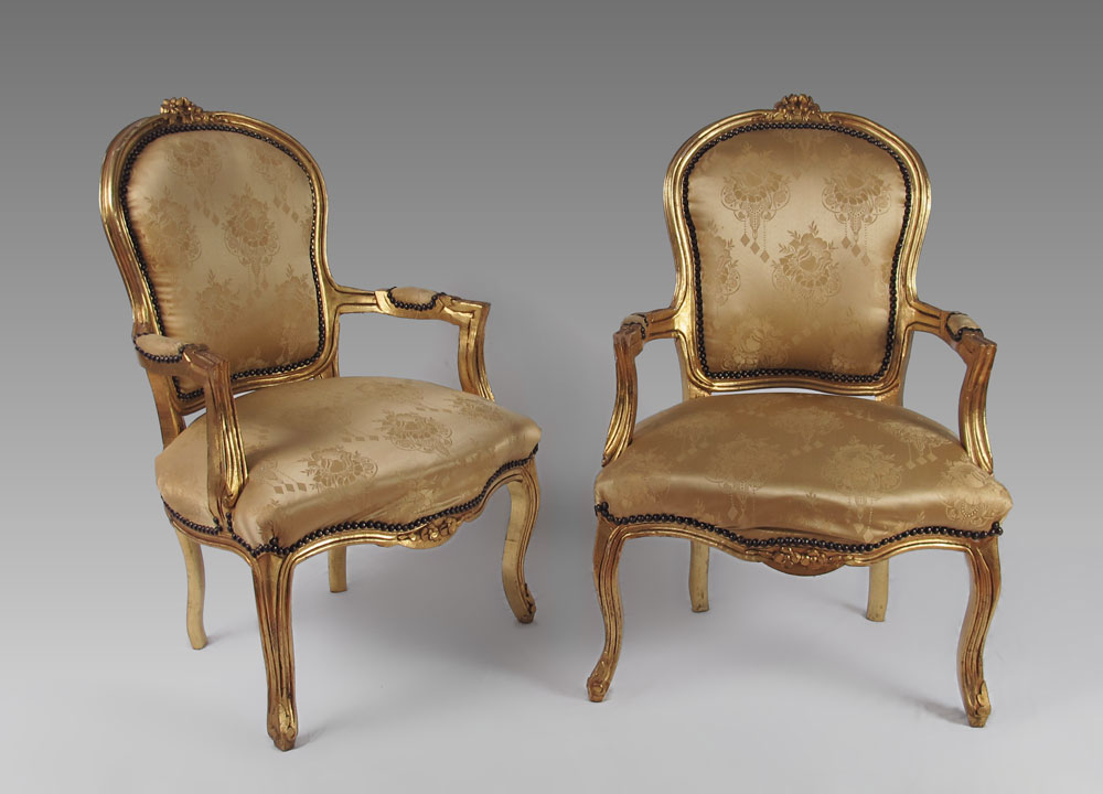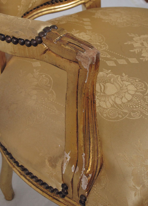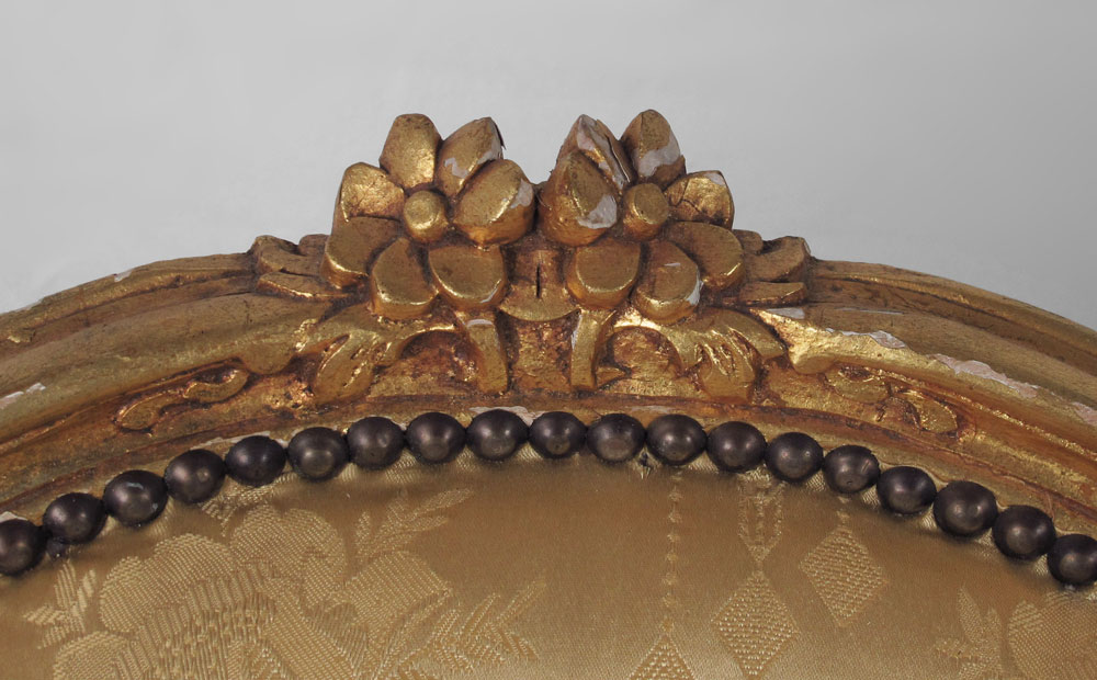 PAIR FRENCH GILT WOOD BERGERE CHAIRS: Carved crest, all over gilt with minor losses. Upholstered in silk. Approx. 37''h x 25''w x 20''d.