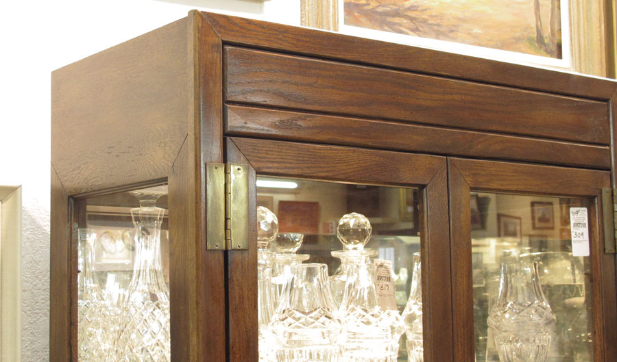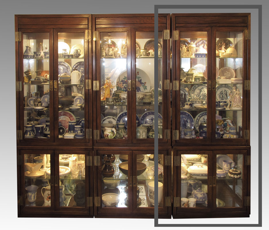 CONTEMPORARY CURIO DISPLAY CABINET: 2 part stacking cabinets, double doors, illuminated interior, glass shelves, with mirror back. 80'' x 30'' x 15'' deep.