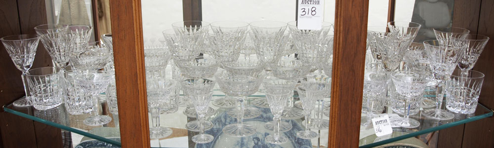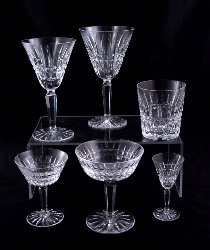 31 PIECE WATERFORD CRYSTAL GLENMORE STEMWARE: Approx. 31 piece in the Glenmore pattern by Waterford Crystal to include 4 water goblets (7''), 5 wine (6 1/2''), 6 sherbets (4 3/4''), 7 liquor cocktail (4 1/8''), 3 cordials (3 7/8''), 6 old fashioned (3 1/2'').