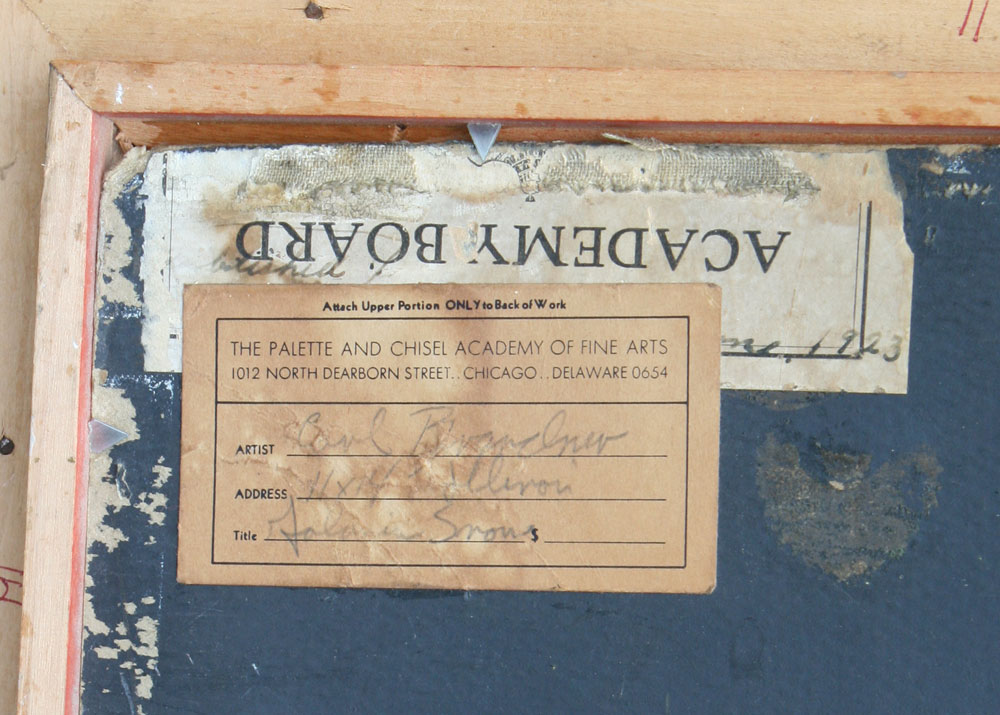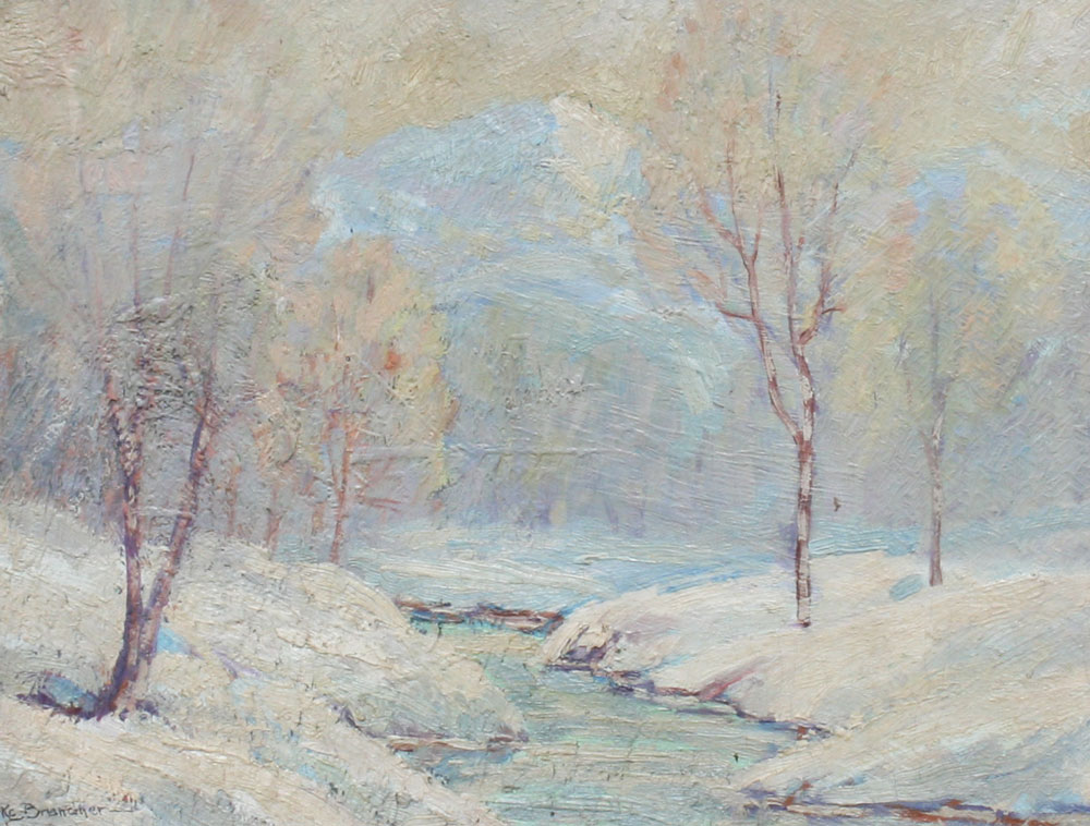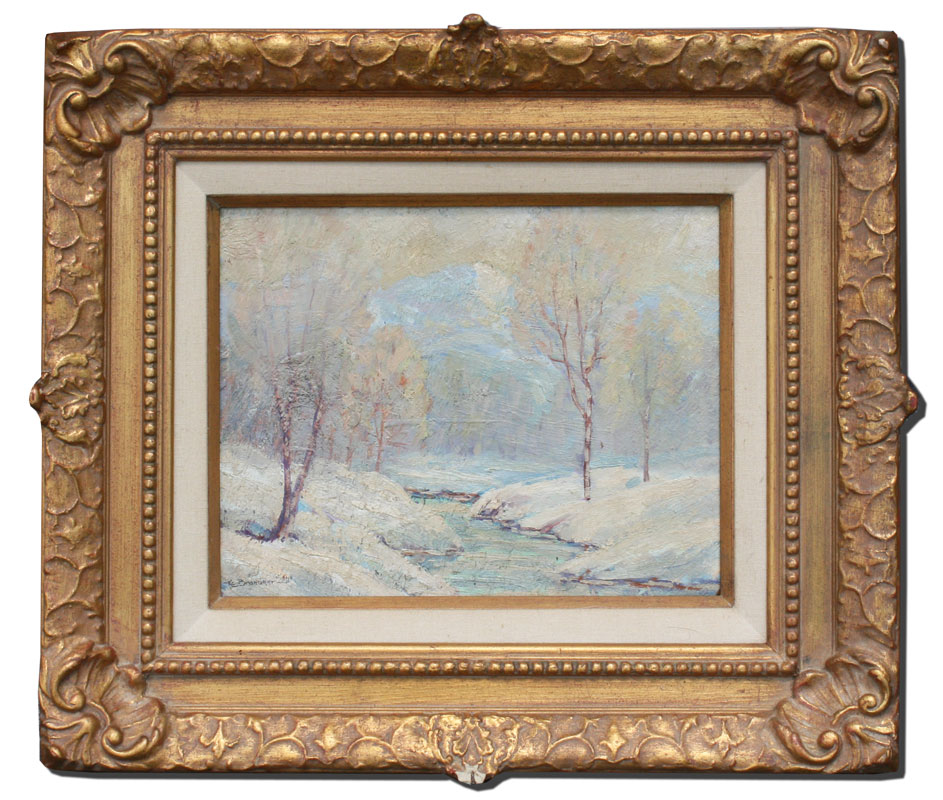 BRANDNER, Karl C., (American, 2898-1961): Snowy Winter Stream Scene, Oil/Board, 11'' x 14'', signed lower left, quality carved and gilded frame, 20'' x 23'', Chicago Galleries Association label affixed verso.