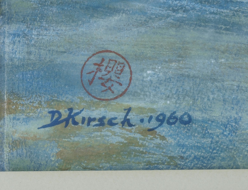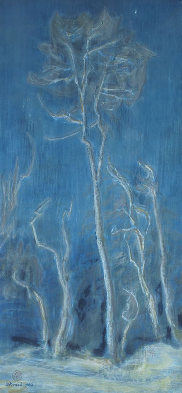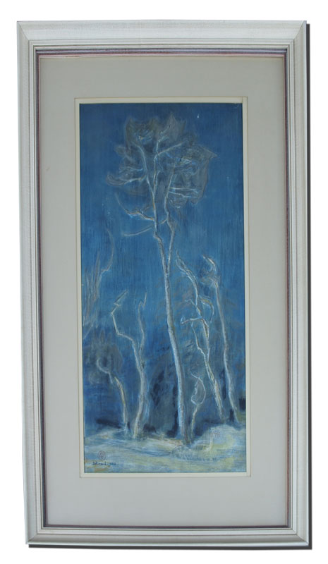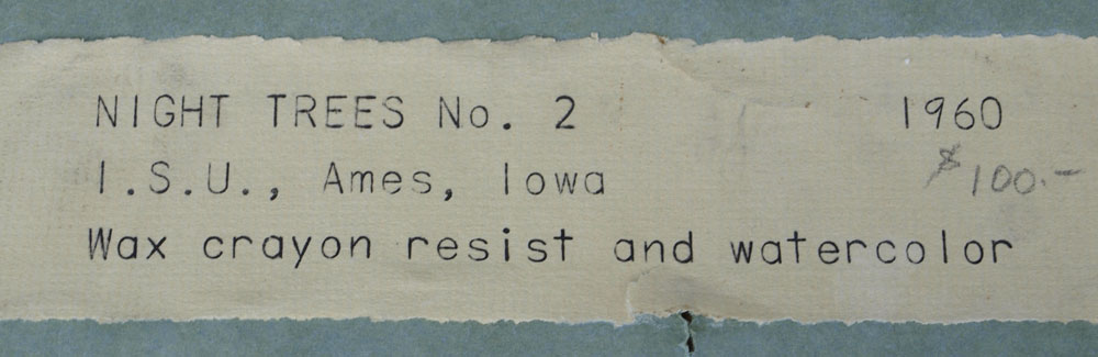 KIRSCH, Dwight, (American, 1899-1981): ''Night Trees #2'', Wax Crayon Resist and Watercolor, sight size 29 1/2'' x 14 1/2'' signed lower right and dated 1960, painted frame, 41'' x 26'', label verso.