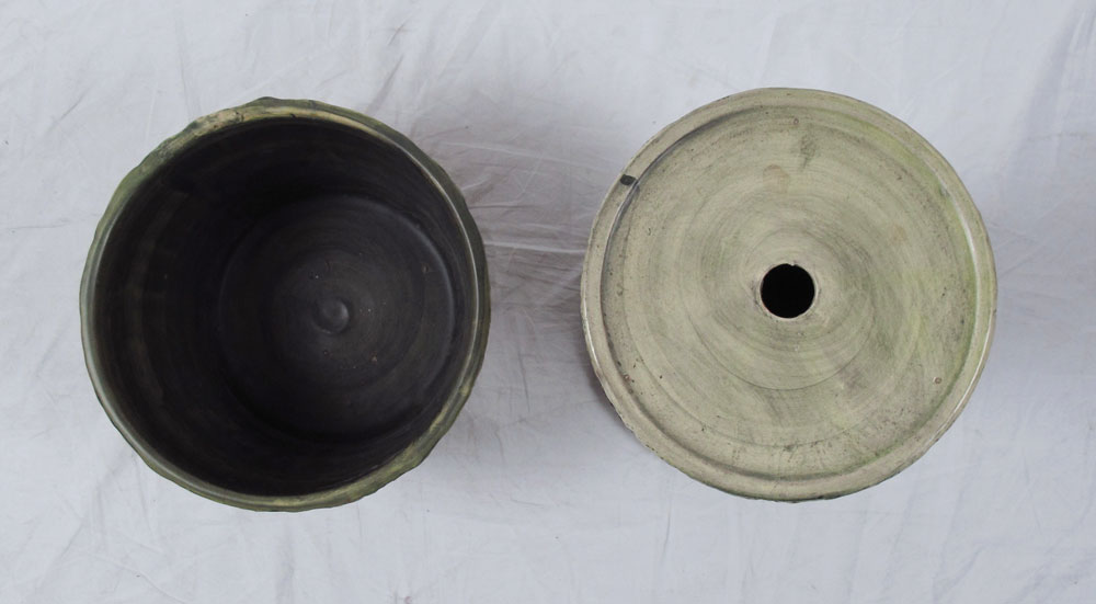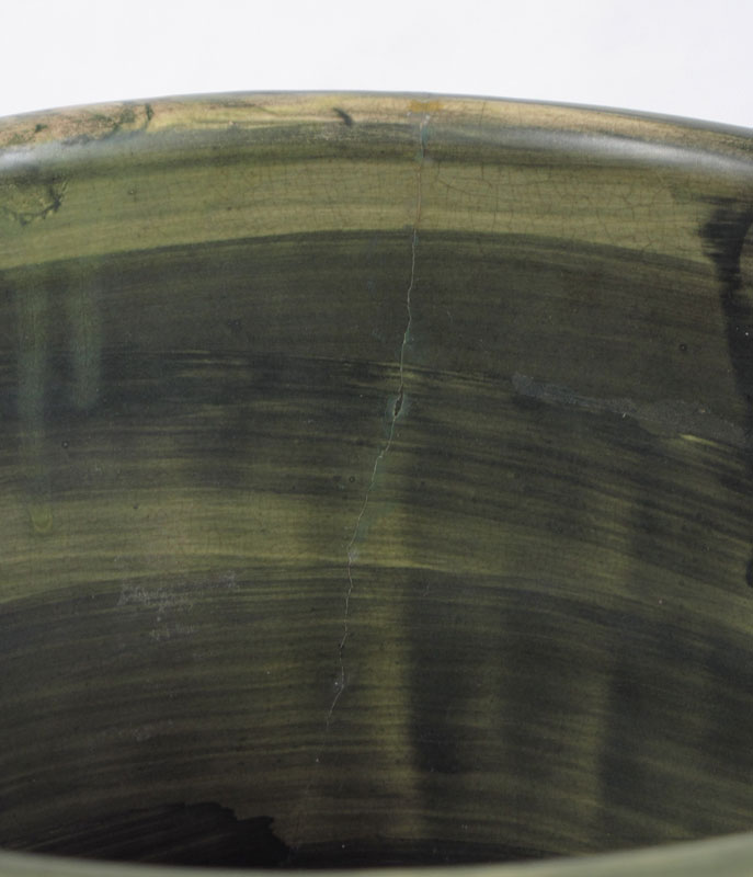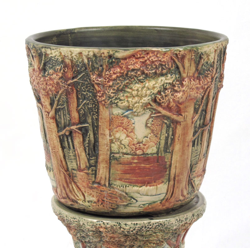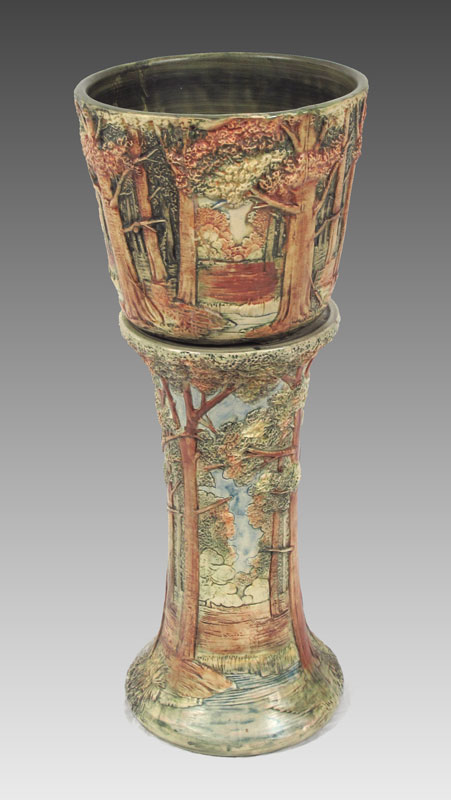 WELLER FOREST JARDINIERE AND PEDESTAL: 18'' tall pedestal, the pot 9'' tall x 11'' dia.