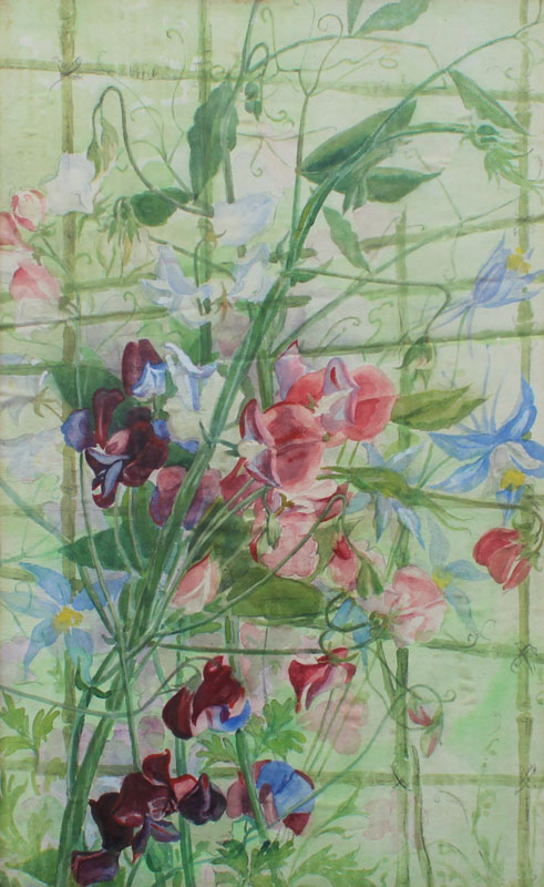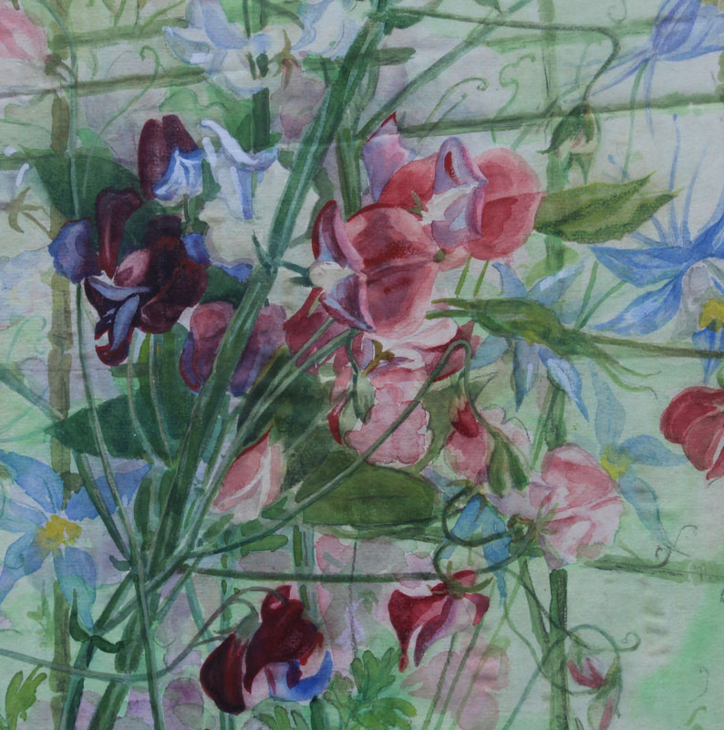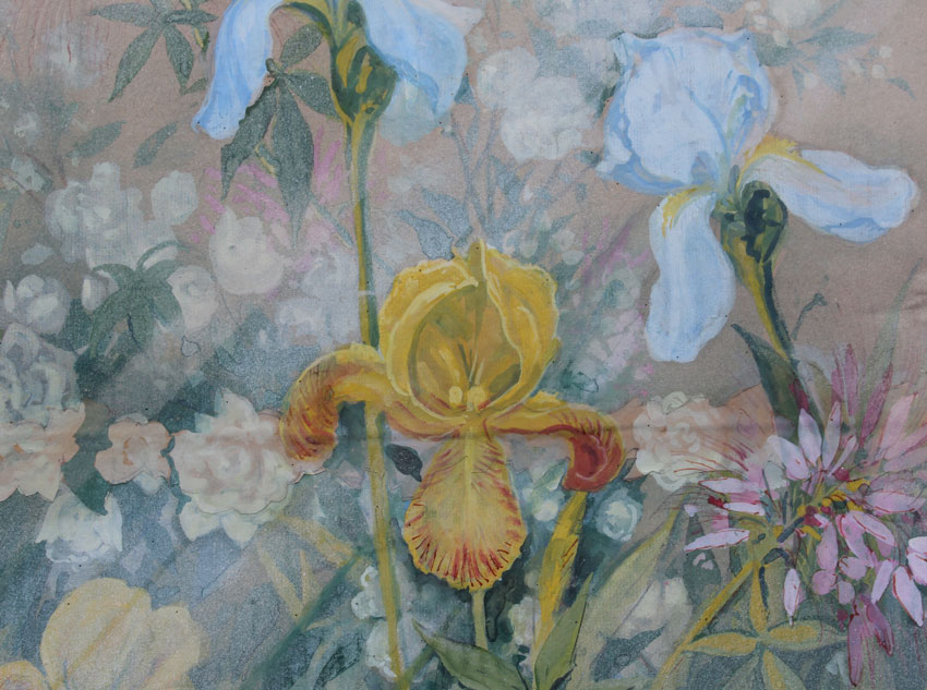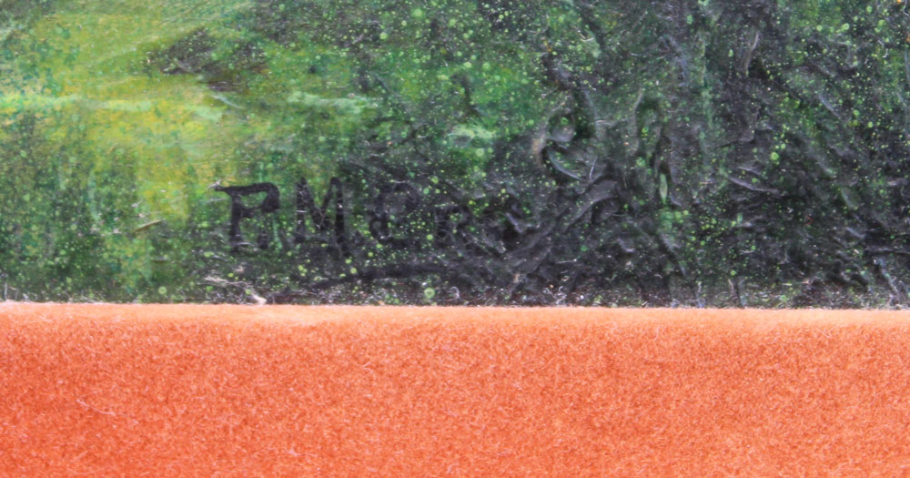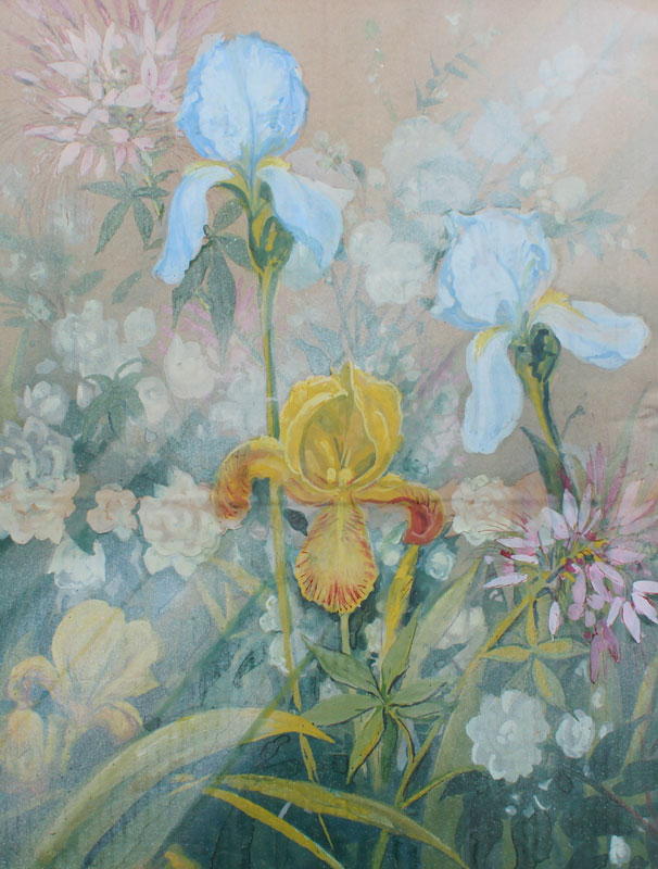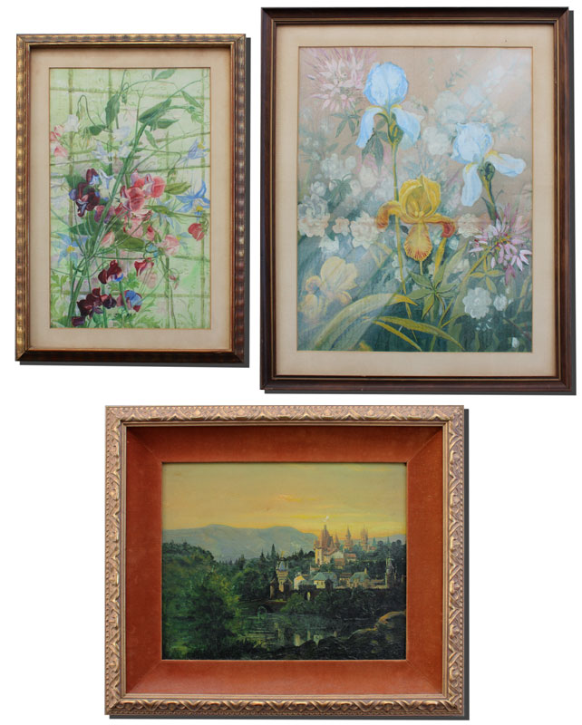 3 PC ART LOT BY P.M. CRU?: 1) European City in the Mountains, Oil/Board, sight size 12 1/2'' x 15 1/2'', signed lower left, encased in gilded frame, 19 1/2'' x 22 1/2''. Abrasion in the upper right quadrant; 2) Greenhouse Still Life, Watercolor and Gouache on Paper Laid Down on Cardboard, sight size 20'' x 16 1/2'', no visible signature, framed 26'' x 21 1/2''. Vertical crease running roughly through the middle of the picture; 3) Floral Greenhouse Still Life, Watercolor and Gouache, sight size 18 1/2'' x 11 1/2'', no visible signature, gilded frame with minor wear, 24'' x 16 1/2''. Laid down on cardboard and there is a horizontal crease running through from the cardboard.