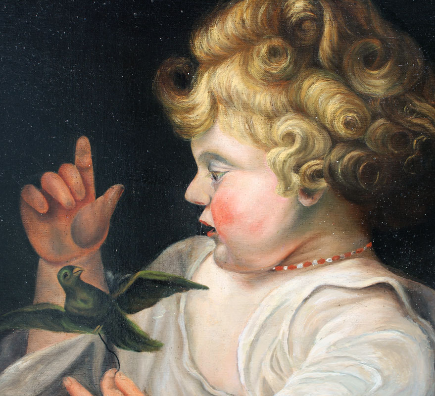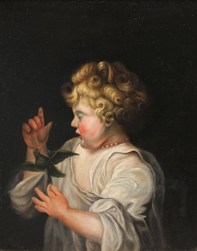 19TH C PAINTING AFTER RUBENS: Of a Boy with Bird, Oil/Canvas Mounted on Board, 27'' x 22'', encased in carved and gilded frame, 35'' x 29''.