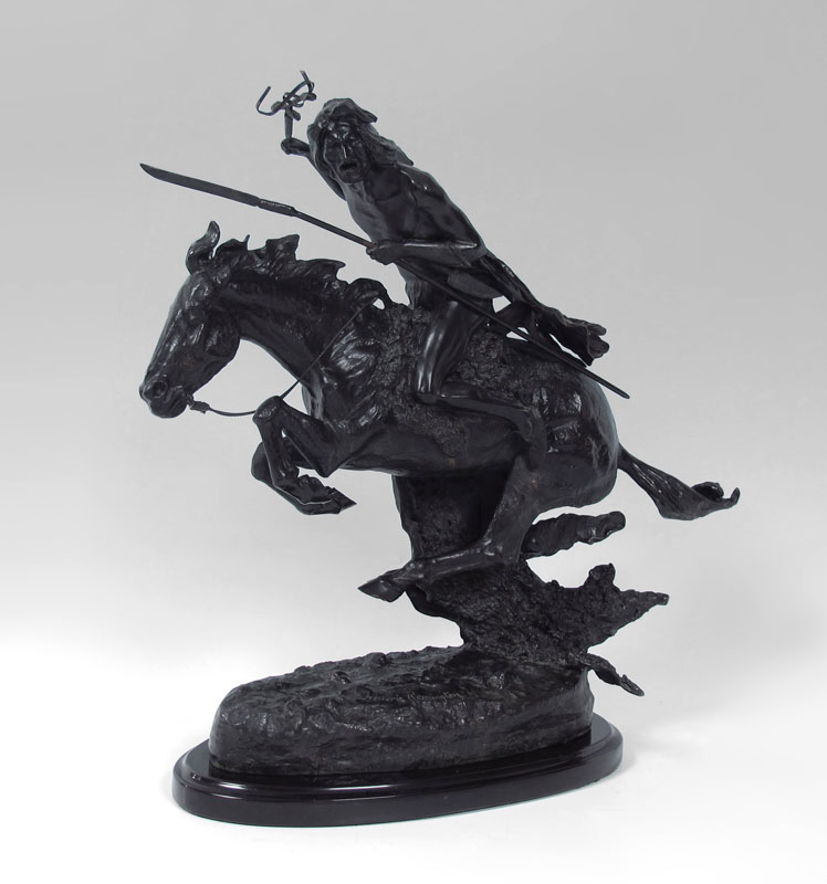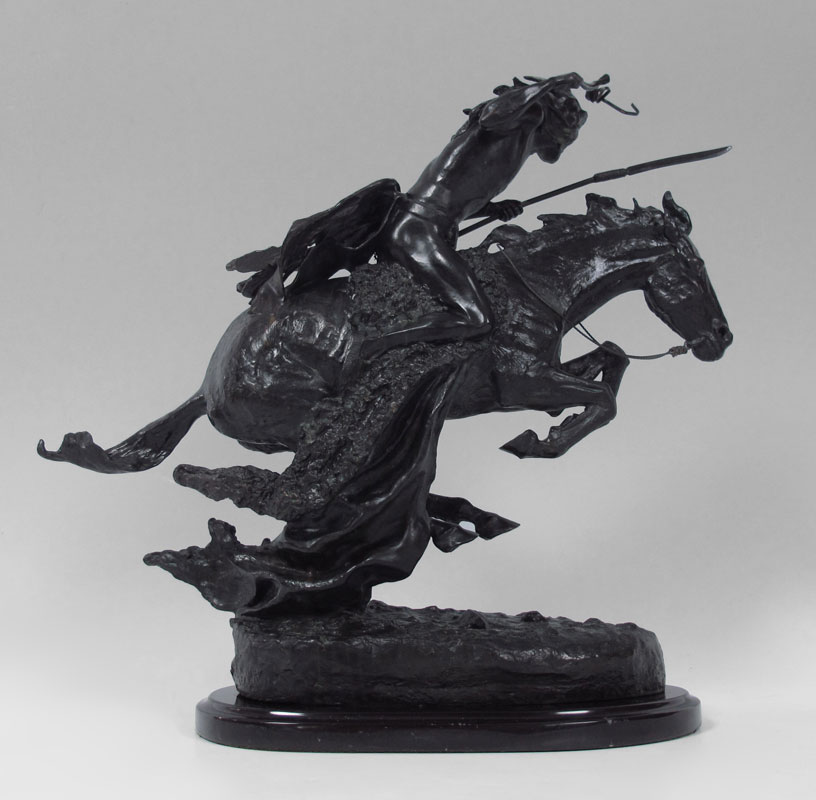 BRONZE CHEYENNE SCULPTURE AFTER REMINGTON: 21'' h, 22 1/2'' w., affixed to beveled marble plinth.