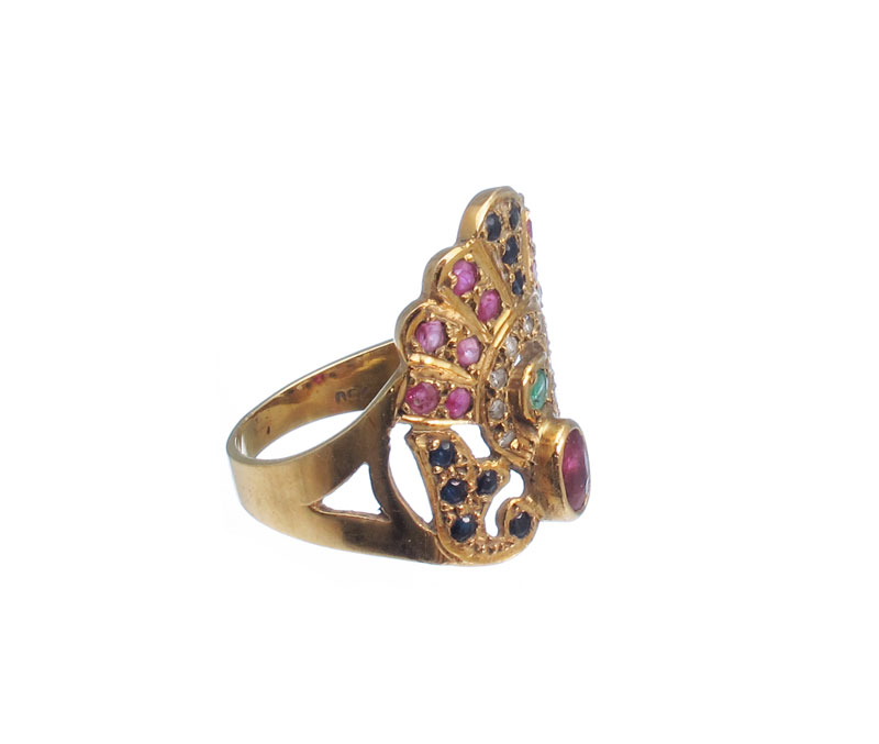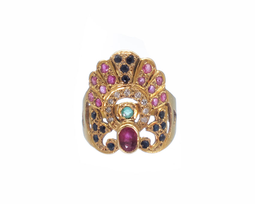 18K GEMSTONE & DIAMOND RING: 18K yellow gold ring contains 28 round and oval mixed cut rubies, sapphires and emeralds. Weight: 1.25 Ct. Approx. 9 round single cut diamonds. Weight: .10 Ct. Approx. SI in clarity and I-J in color. Weight: 5.9 grams. Size: 7.5