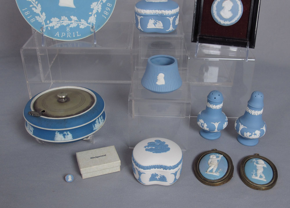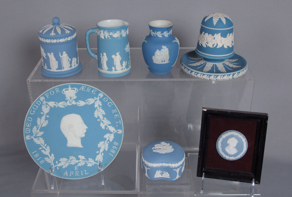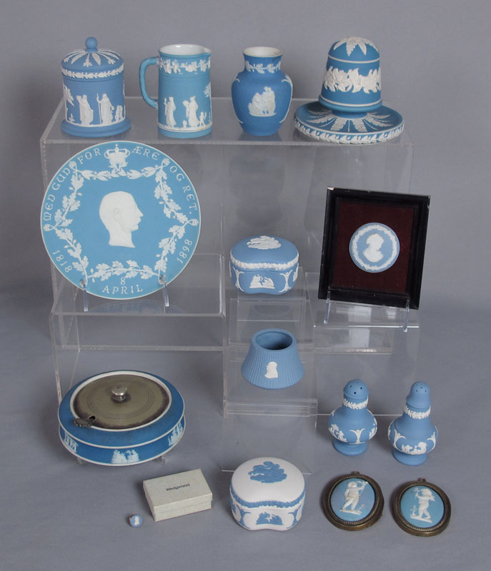 15 PIECE BLUE WEDGWOOD JASPER: Wall plaque exclusively for the Danish market, commemorating the 80th birthday of King Christian IX. ''with the god of honor and right''. (7 1/4''), sugar bowl, 4'' vase, 4'' pitcher, match holder with striker, shakers, covered jars, 2 3/4'' oval cherub plaques.