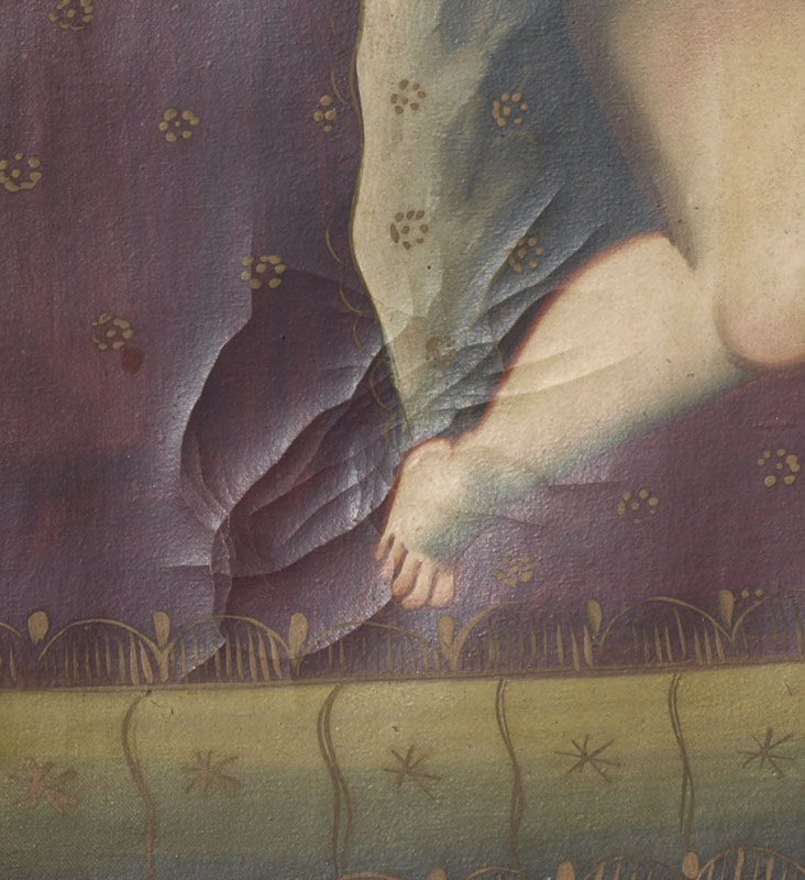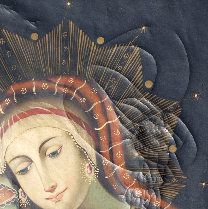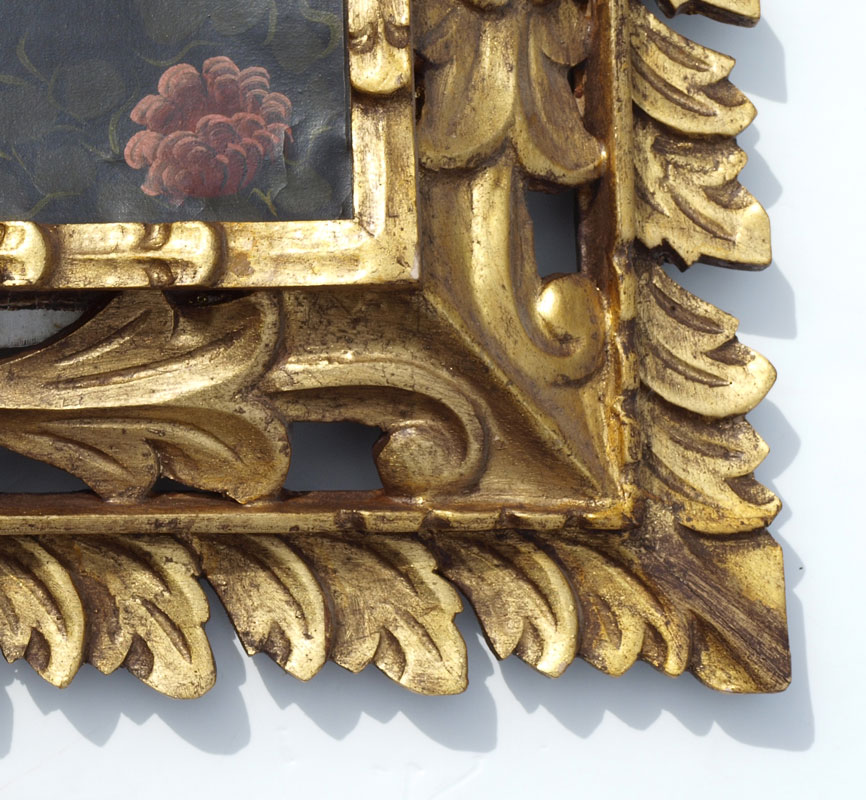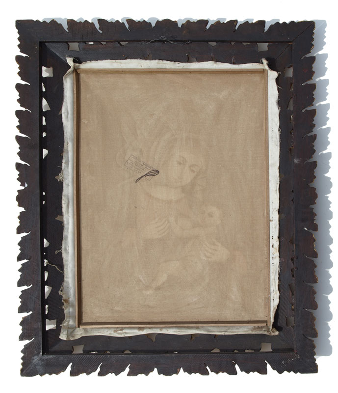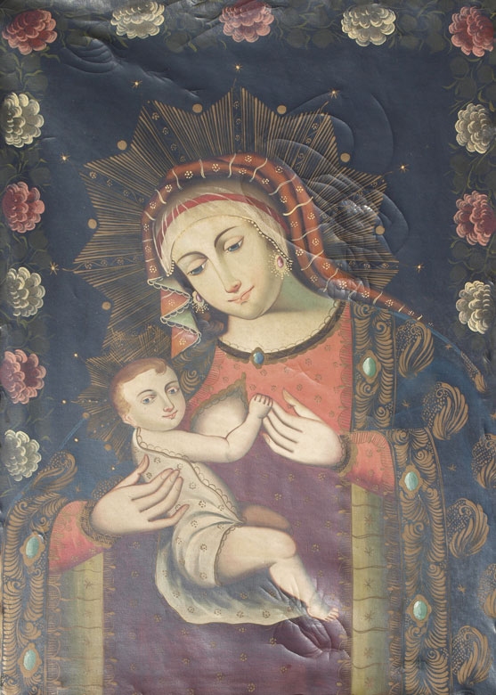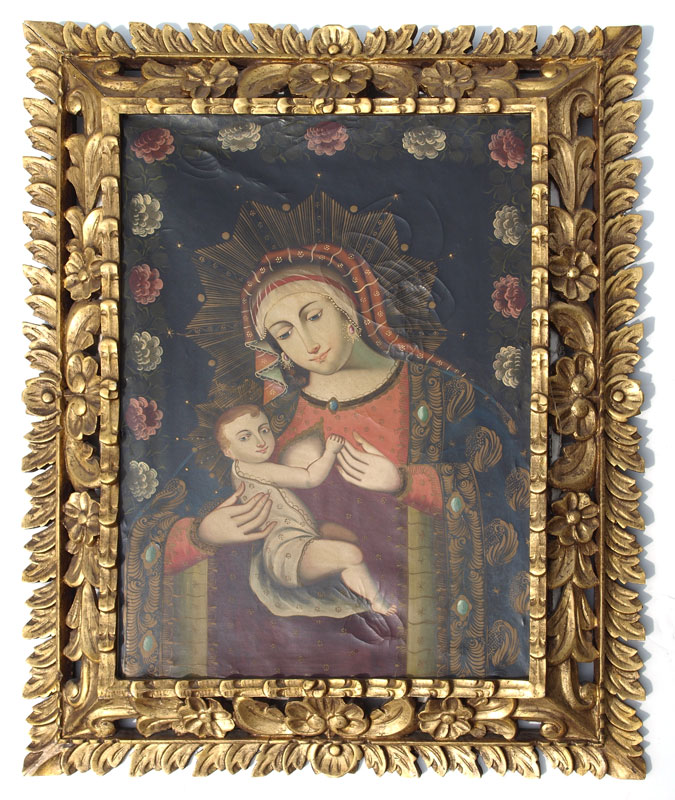 CUZCO SCHOOL MADONNA AND CHILD: Oil/Canvas, 27 1/2'' x 19 1/2'', pierce carved and gilded wood frame, 37'' x 29 1/2''.