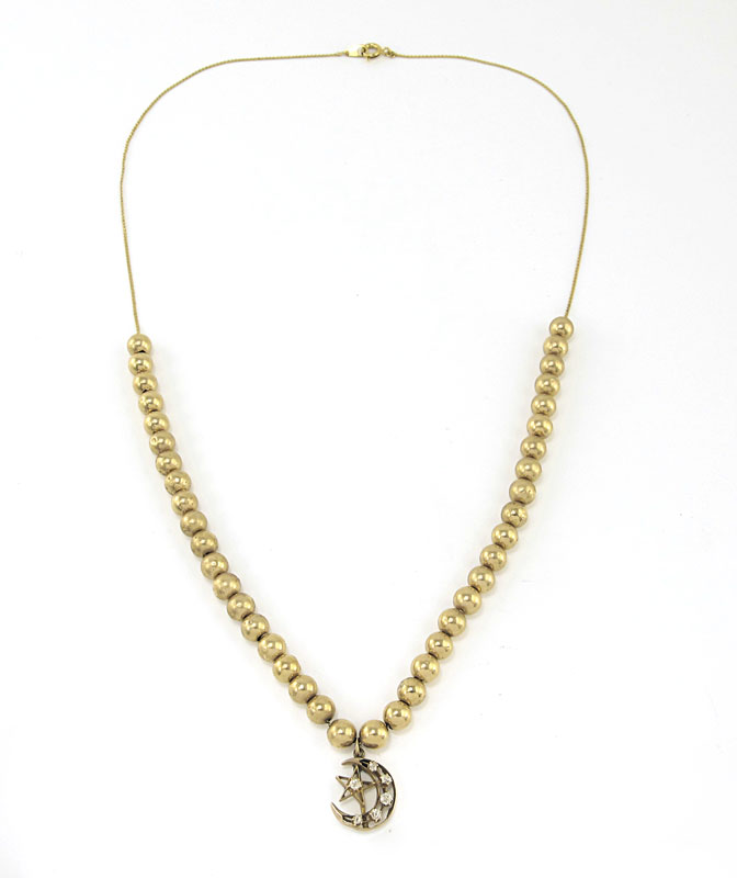DIAMOND MOON & STAR PENDANT WITH GOLD BEADS: 14K moon & star pendant with six old mine cut diamonds, approx. .30 Ctw. Rated VS-SI in clarity and M-N in color. The diamonds are prong set. 40 14K 7.00 mm beads, some with tiny dents. Weight: 7.5 grams approx. The chain is not gold.