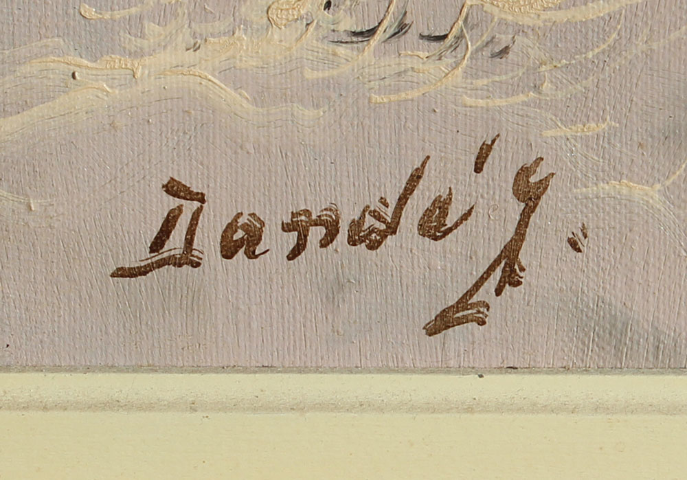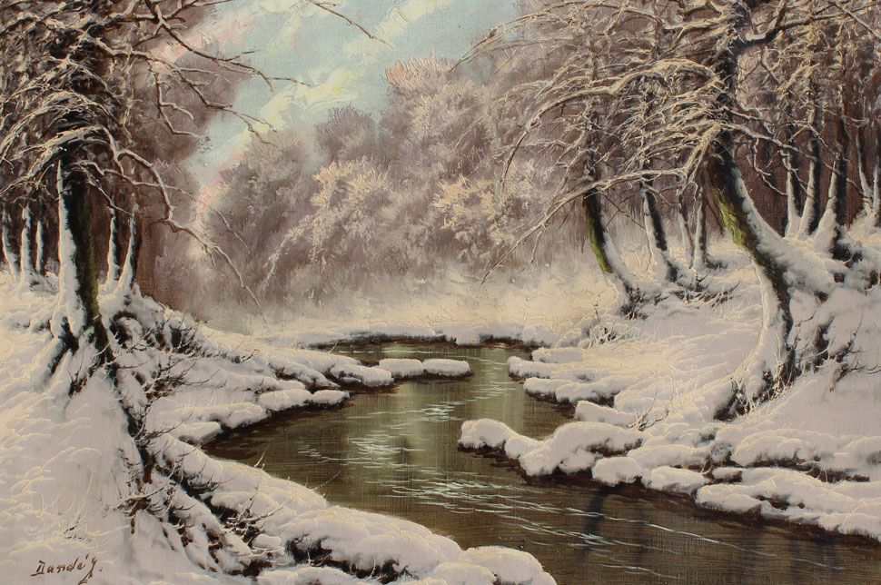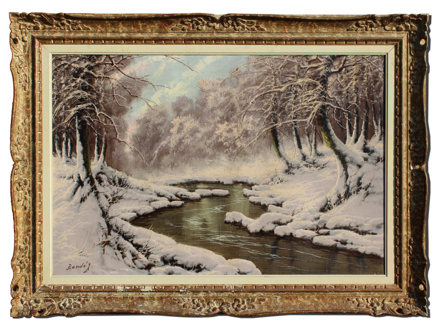 DANDE, J., (European, 20th C): Winter Stream, Oil/Canvas, 24'' x 36'', signed lower left, encased in original carved and painted frame, 33'' x 44''.