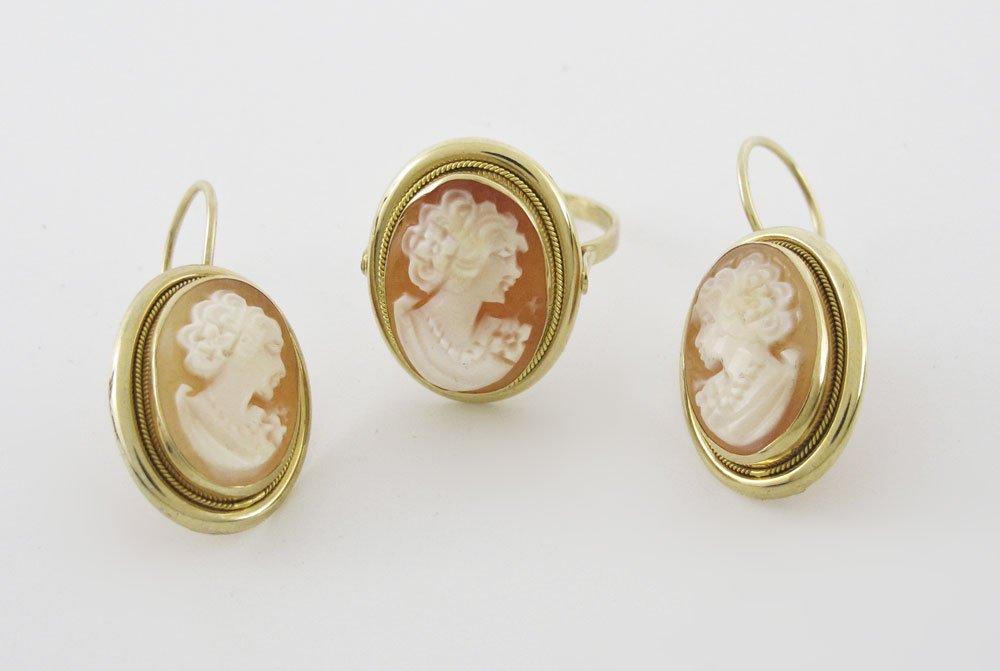 14K GOLD CAMEO EARRINGS AND RING: Matched set shell carved cameos in 14K yellow gold. Ring, size 9. Earrings and ring measure approx. 3/4''.