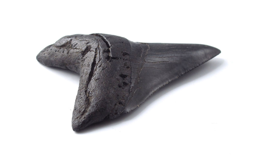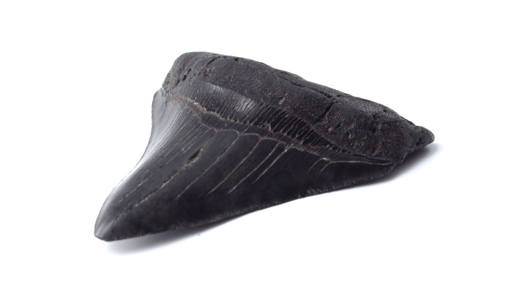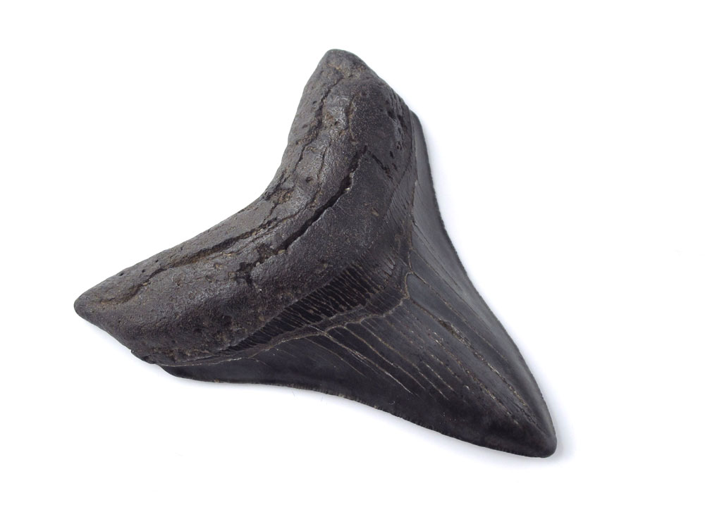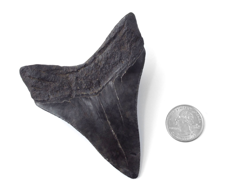 MEGALODON FOSSIL SHARK'S TOOTH: Carcharodon Megalodon tooth with nice enamel and serration. 3 3/4'' l. x 3 1/8''.