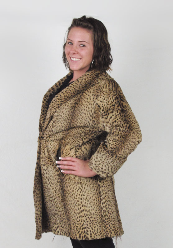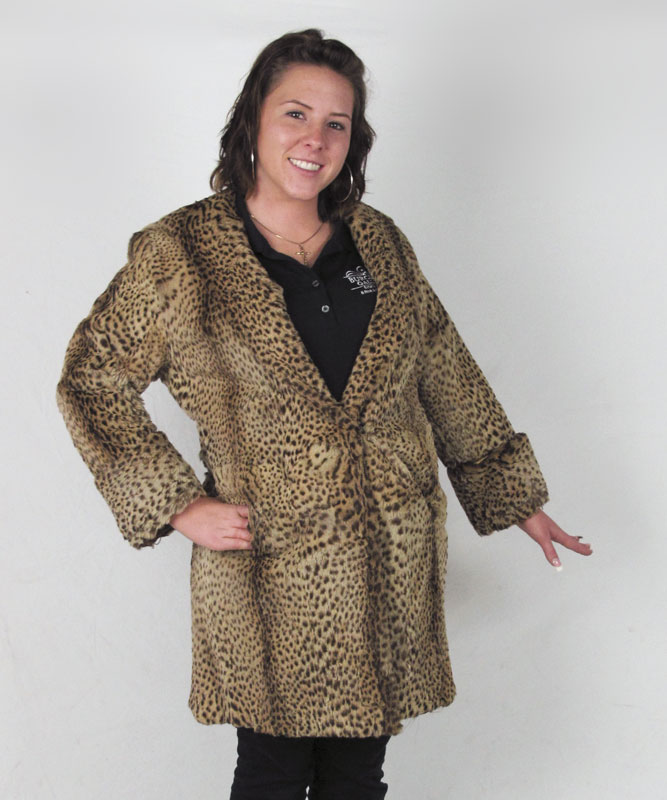 STROUSS HIRSHBERG'S LEOPARD FUR FULL LENGTH COAT: Young Leopard Fur Coat with wide collar and cuffs. Lined in tan satin, coat has exterior pockets and is small to medium in size and 36'' in length. Cuff and sleeves have moderate wear with the lining frayed and needing to be replaced.
