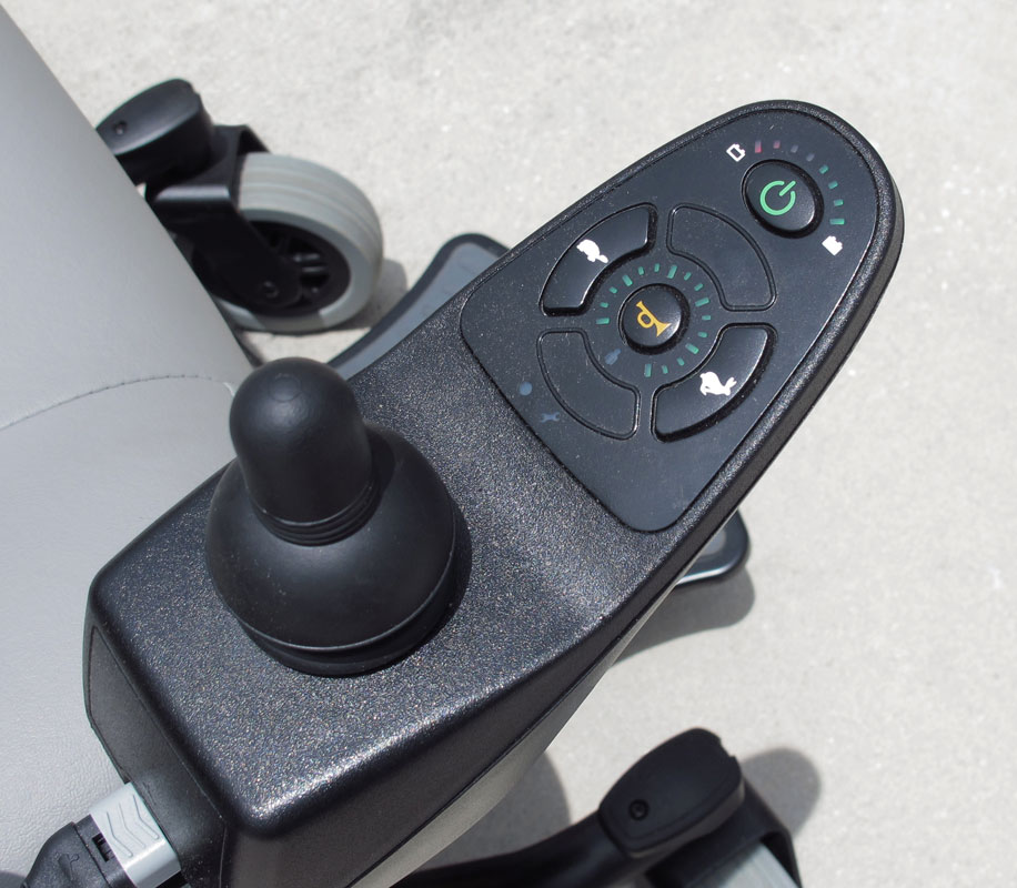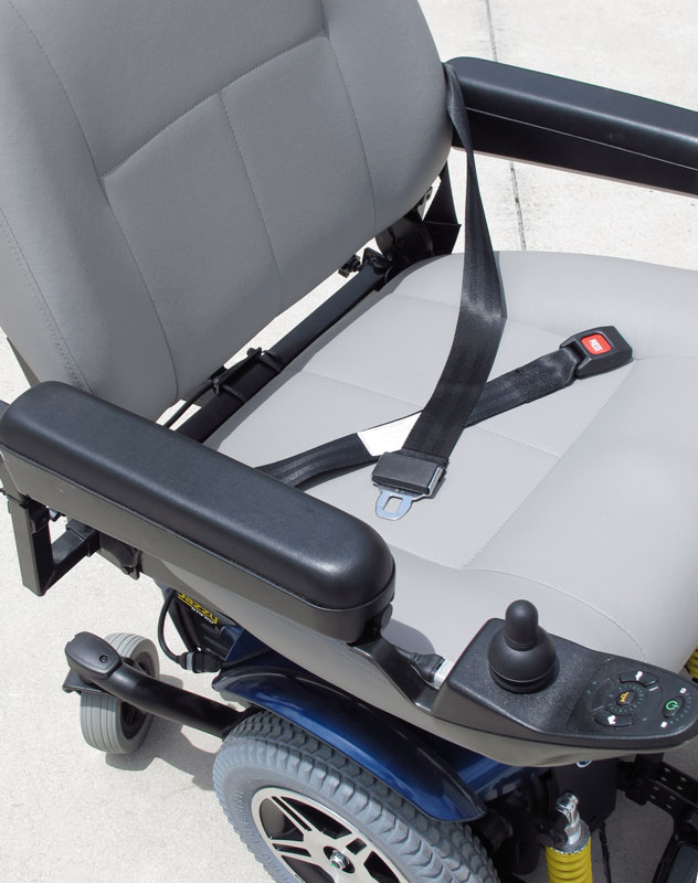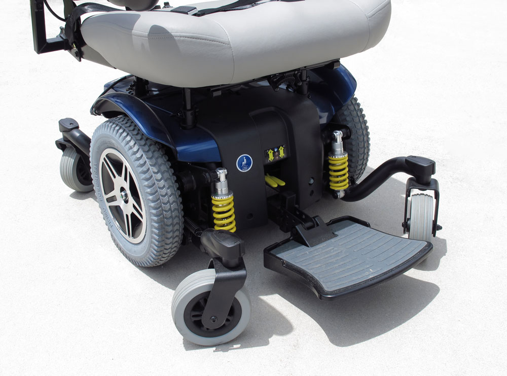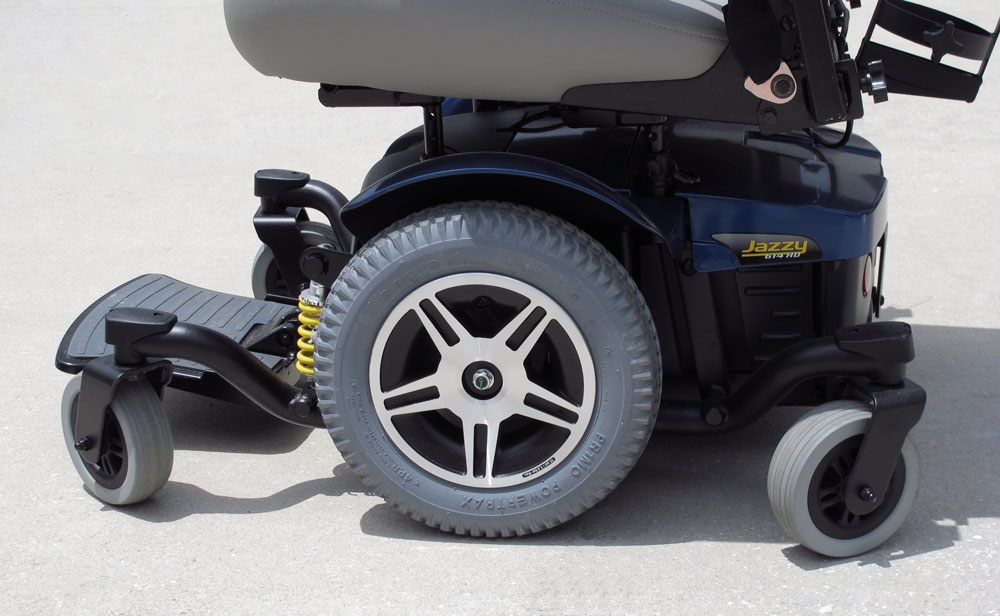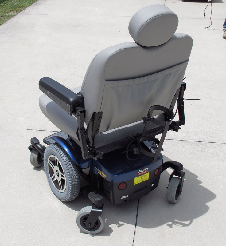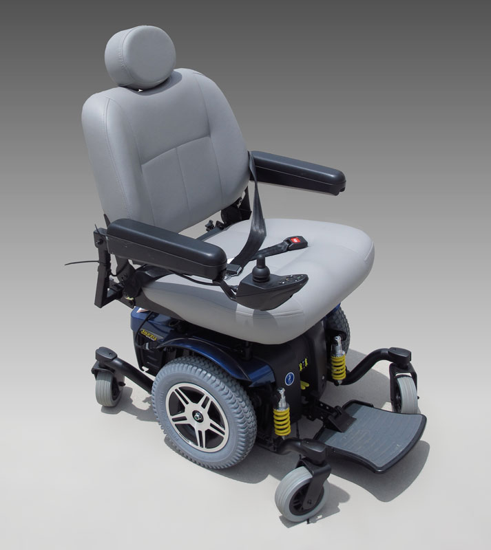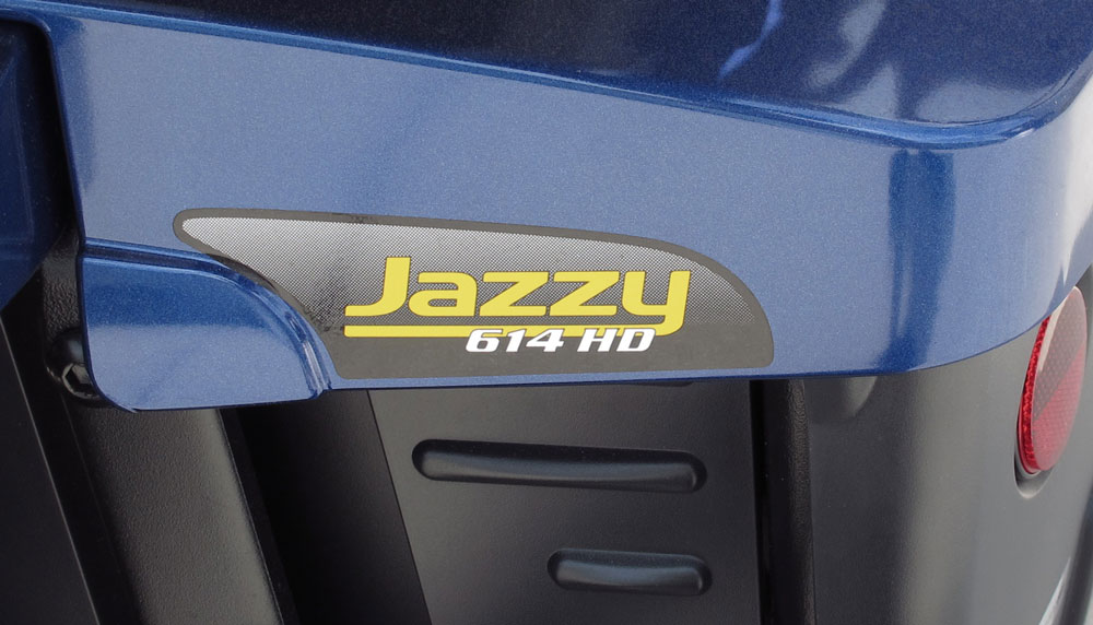 JAZZY 614 HD PRIDE MOBILITY MOTORIZED SCOOTER POWER CHAIR: From Pride Mobility, center wheel drive with castors. Dual in-line motors with a 450 pound capacity. Additional oxygen tank holder affixed to back of chair. Sold with charger. Retails new for $3,699. Measures 45 1/2'' x 28 1/2'' x 42 1/2''.