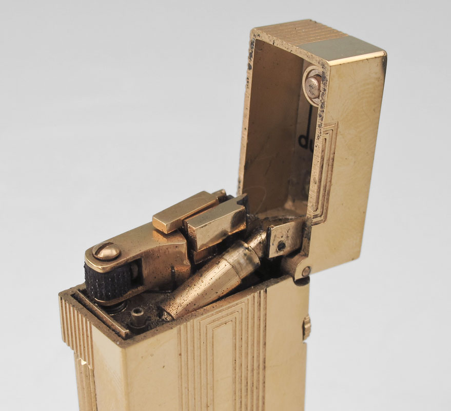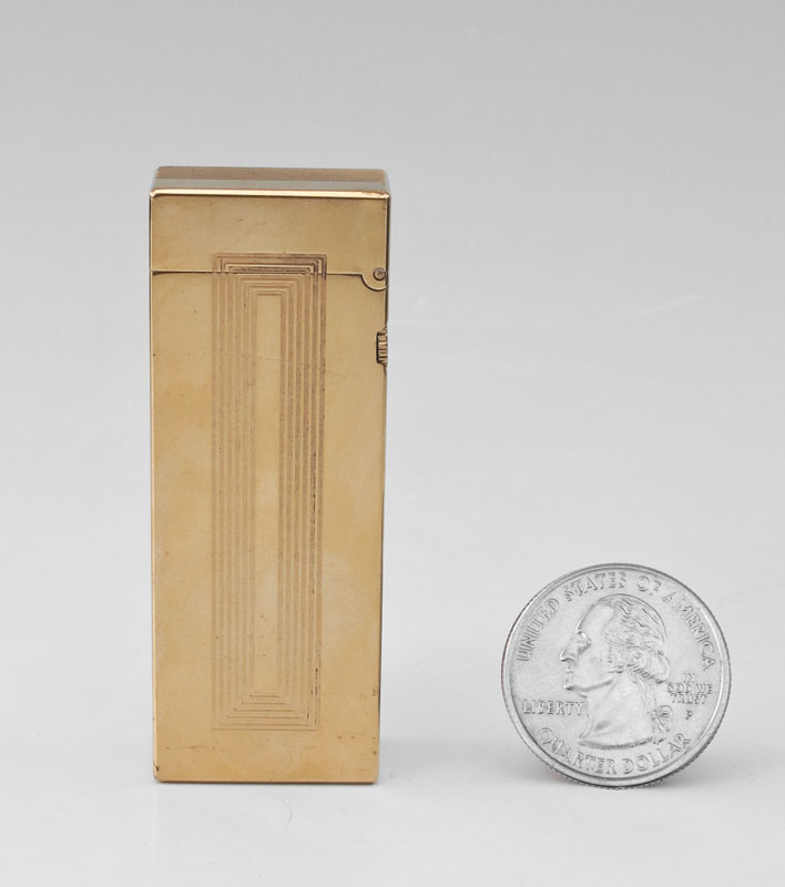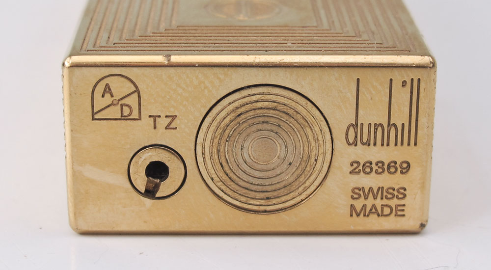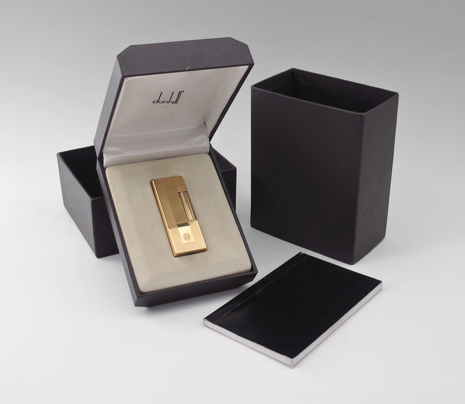 GOLD TONED DUNHILL LIGHTER: Serial number 26369. Lightly used with minor scratches. Sold with original box and instructions. Lighter 2 1/2'' l. Box 2 3/8'' h. x 5 1/4'' x 4 1/4''.