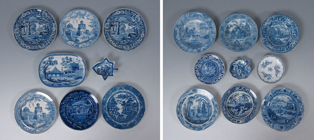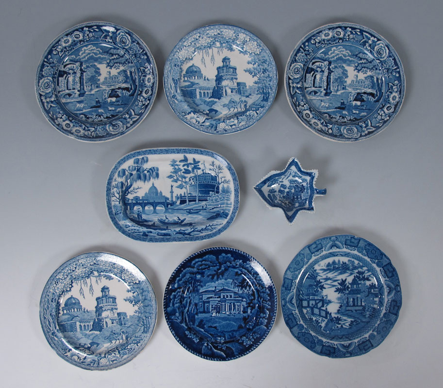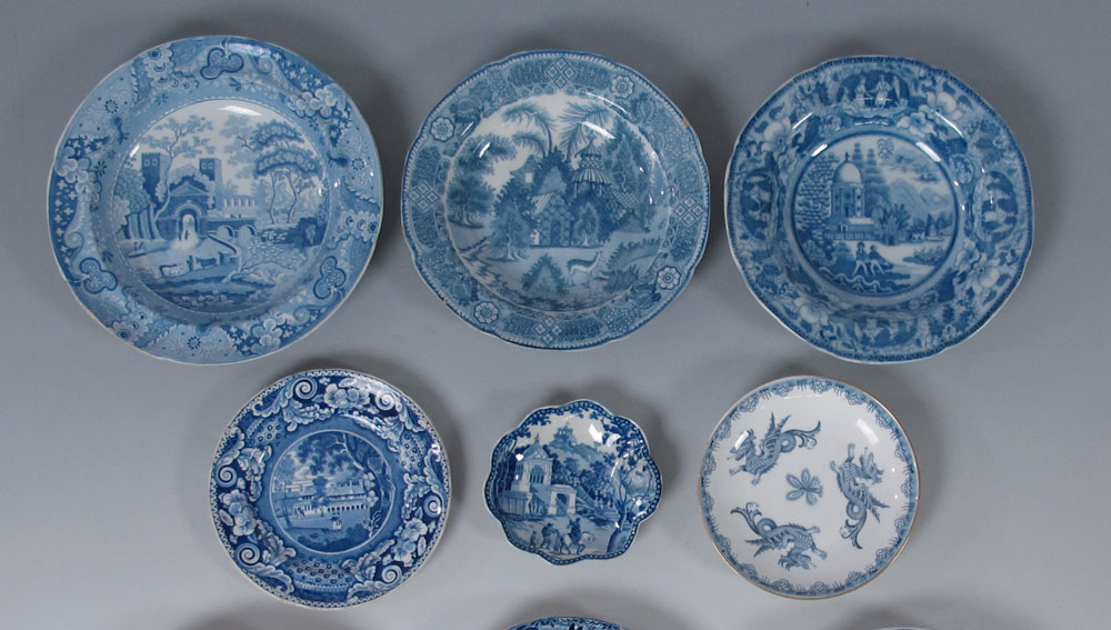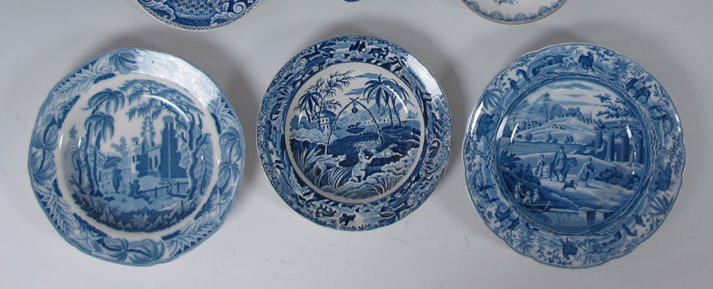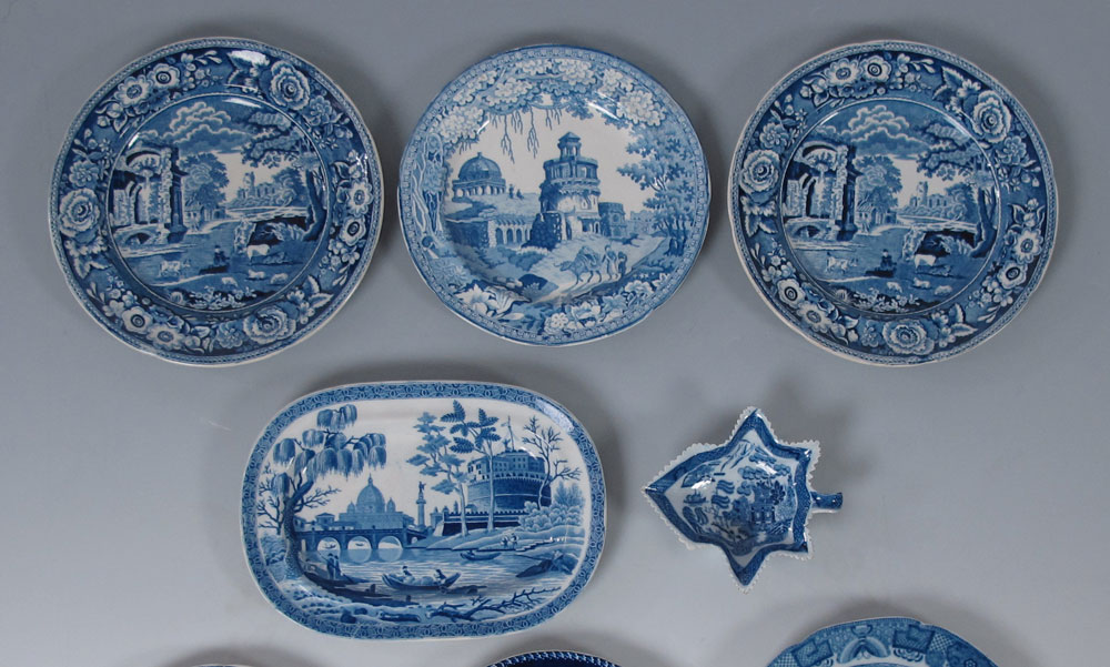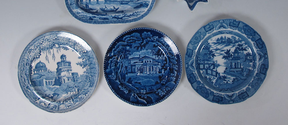 17 PIECE BLUE AND WHITE STAFFORDSHIRE PLATES: 6 round plates - 1) Historical Adams ''Villa in Regents Park London'', 8 3/4' dia. 2) Ca. 1820's Stevenson Blue Willow. 3&4) Stubbs Italian pattern. 5-6) Rogers Burslem Monopteros. There are 6 low soup bowls. 1) Clews Castle. 2) A Spode scene of a caravan 3) Chalinor Oriental Sports. 4) A tomb pattern 5) An Oriental deer pattern 6) Davenport Chinoiserie Ruins. Also a 10 1/2'' Spode Tiber platter, Davenport Chinese Dragon bowl, 6 1/2'' dia. a 7'' Kings of Cottage Windsor Park plate, a leaf shape Blue Willow dish, and a small shell shape dish.