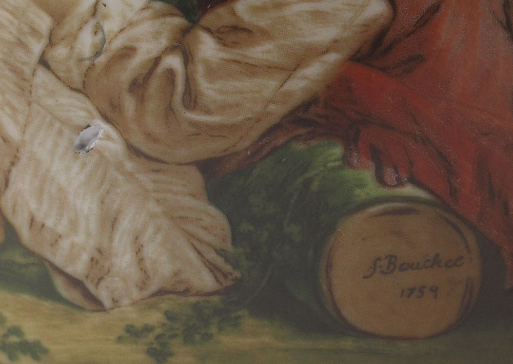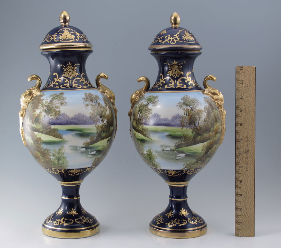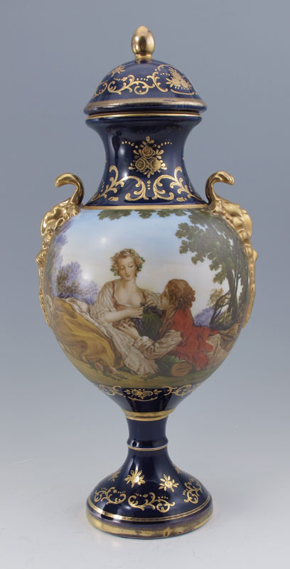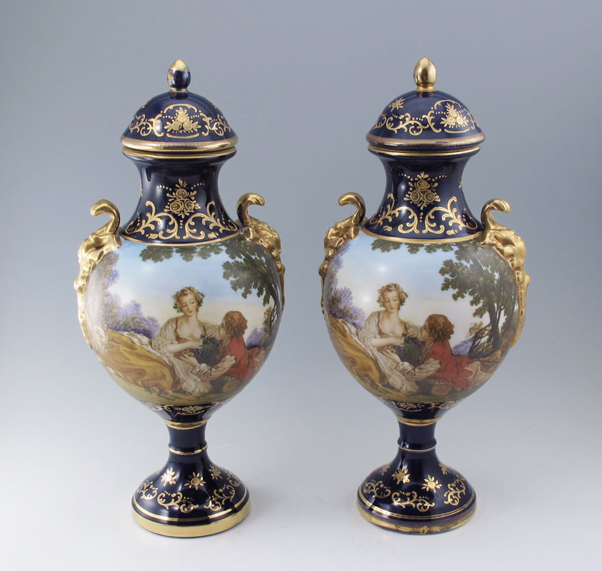 PAIR PORCELAIN URNS AFTER FRANCOIS BOUCHER: A matched pair of Sevres style covered urns or vases. Paint enhanced transfer romantic image continuing to the back. Parcel gilt cobalt glaze. Approx. 16'' tall. Gold fleur di lis mark.