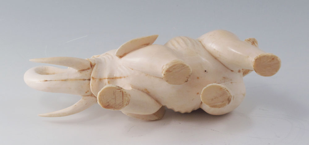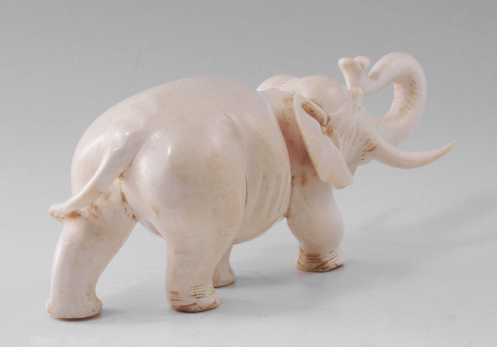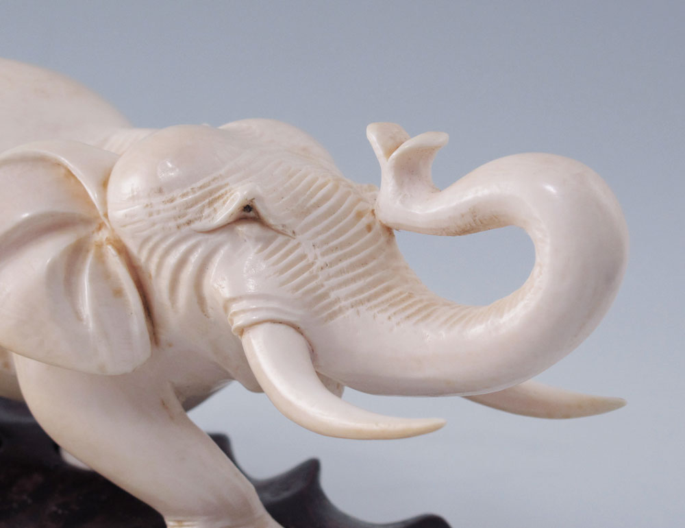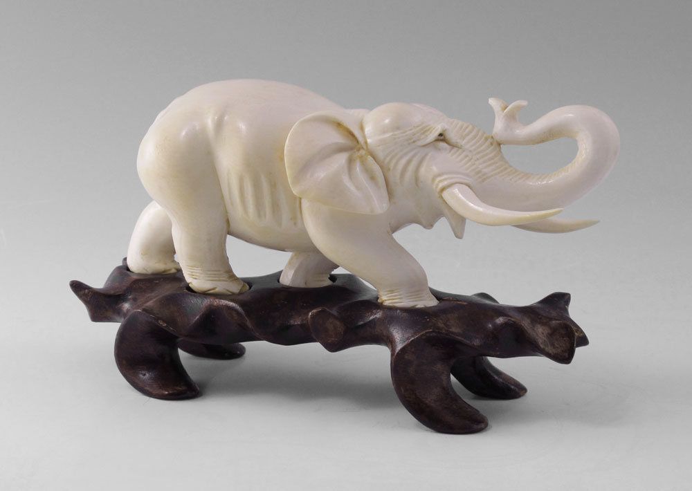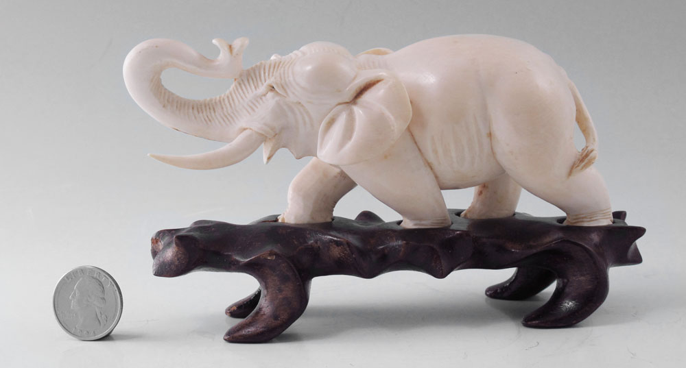 IVORY ELEPHANT: 2 1/2'' h. x 6 1/2'' h. on carved stand.