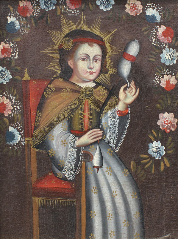 RELIGIOUS CHRIST CHILD PAINTING: Christ Child holding a skane of silk and bobbin, OIL/Canvas, 18'' x 14'', gold frame, 22'' x 18''.