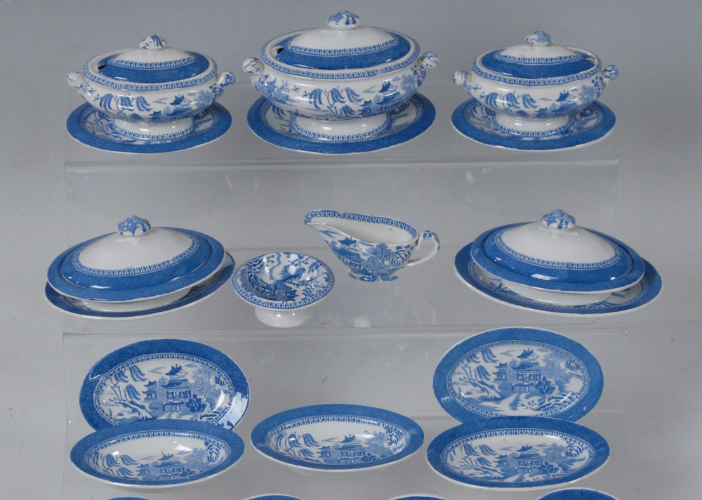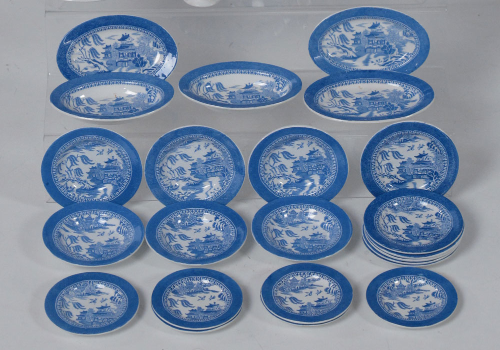 19TH C COPELAND CHILD'S BLUE WILLOW CHINA: 35 pieces to include 3 tureens with underplates, 2 covered vegetable dishes, gray boat, 2 open oval vegetable dishes, 6 salad plates, 6 dinner plates(3 7/8''), 6 soup bowls, 5 platters in graduating size 4 3/4''-6'' and a pedestal fruit bowl.