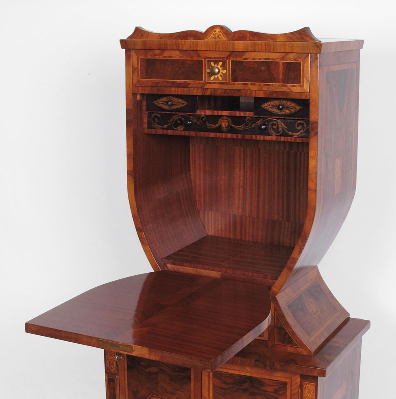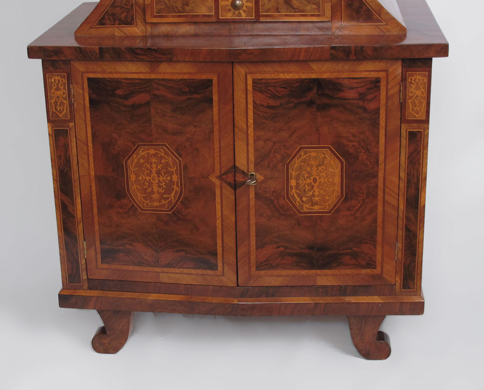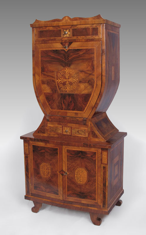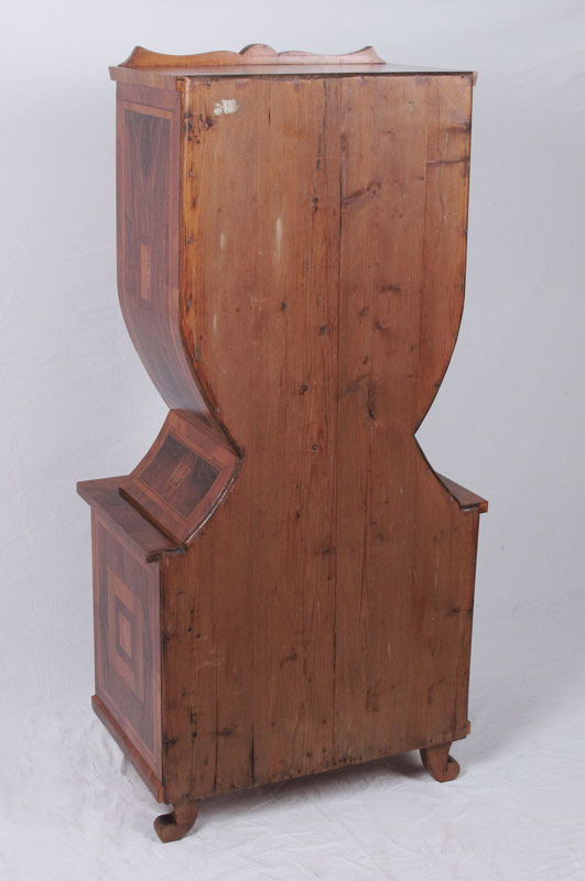 BIEDERMEIER STYLE SIDE CABINET: Unusual hourglass shape with extensive parquetry and banded inlay. Fall front, as for a secretaire. 61'' h. x 29 1/4'' x 18''.
