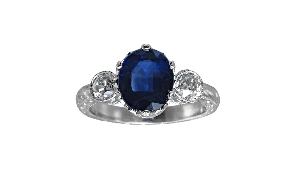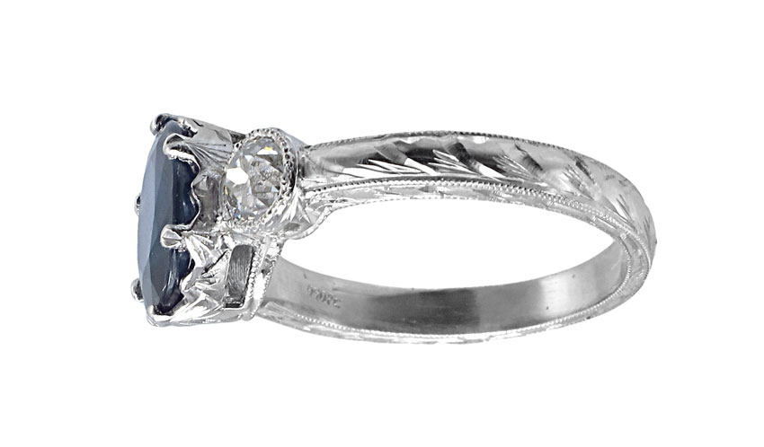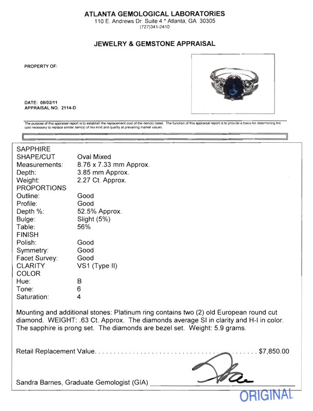 PLATINUM SAPPHIRE AND DIAMOND RING: Platinum ring centers a 2.27 Ct single sapphire, oval mixed cut, VSI clarity, B hue, 6 tone and 4 in saturation. This beautiful stone is flanked by 2 Old European round cut diamonds, approx. .63 Ctw., averaging Si in clarity and H-I color. The sapphire is prong set, the diamonds bezel set. Size 6. Weight 5.9 grams. Sold with current Atlanta Gemological GIA graduates appraisal for $7,850.