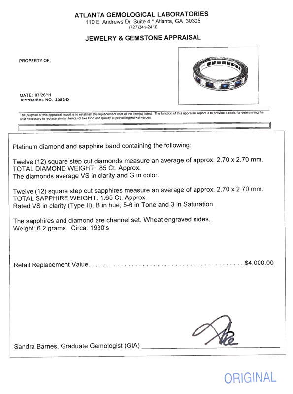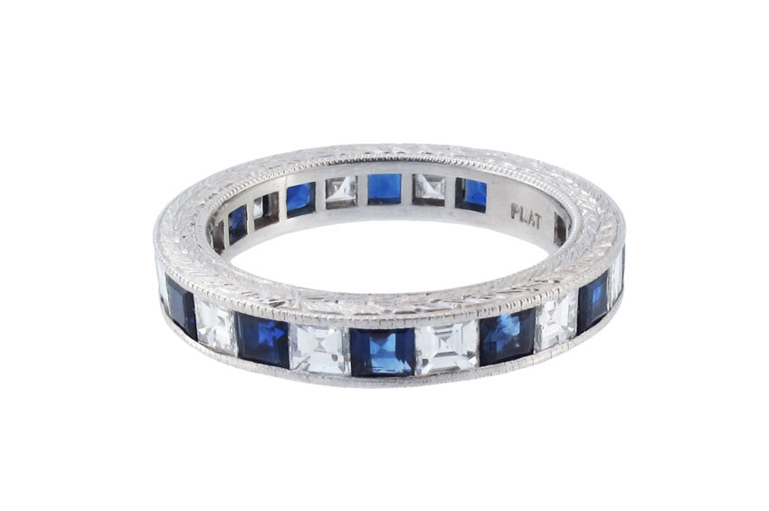 1930's SAPPHIRE AND DIAMOND ETERNITY BAND: Platinum band contains 12 square step cut diamonds, approx. .85 Ctw., average VS in clarity and G color. The sapphires are also step cut, all totaling 1.65 Ct., rated VS in clarity, B hue, 5-6 tone and 3 in saturation. All stones are channel set. Wheat engraved sides. Size 7. Weight 6.2 grams. Sold with current Atlanta Gemological's GIA graduates appraisal for $4000.