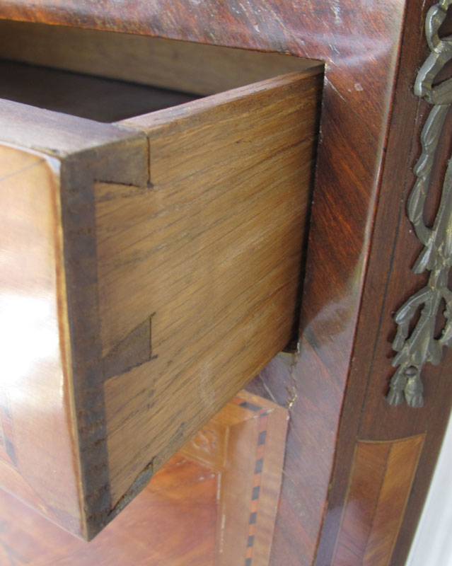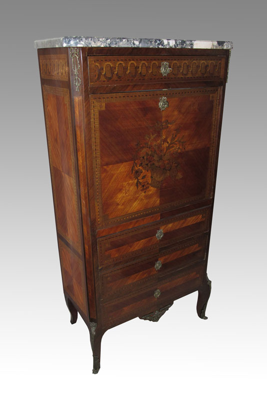 MARBLE TOP FRENCH SECRETAIRE ABATTANT: Variegated marble top with inlaid single drawer over fall front door with inlaid floral basket. Door opens to reveal single shelf over 4 drawers with leather inset writing surface, over 3 full length drawers all on 4 legs. Parquetry and string inlaid sides with ormolu accents. Key in office. 56 3/4'' h. x 28 3/4'' x 15 3/4'' overall.