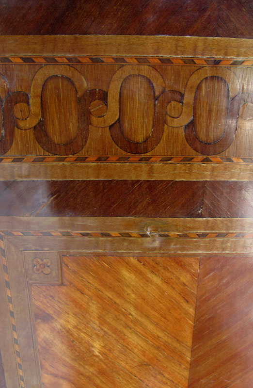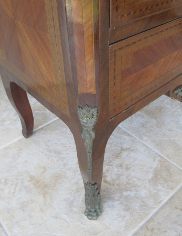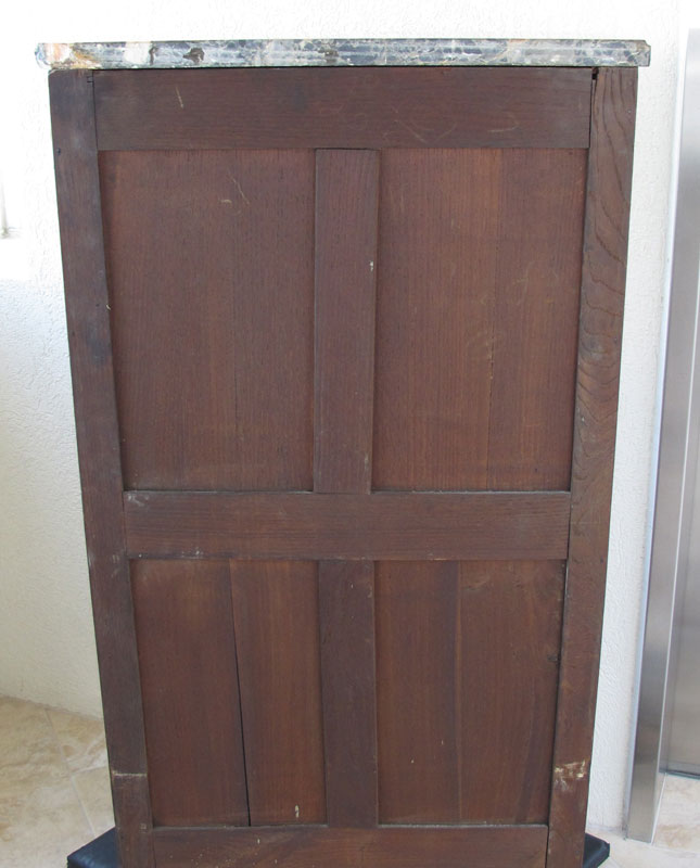 CONDITION: Note small piece missing to the rear right of the marble top, several nicks and scratches to veneer.