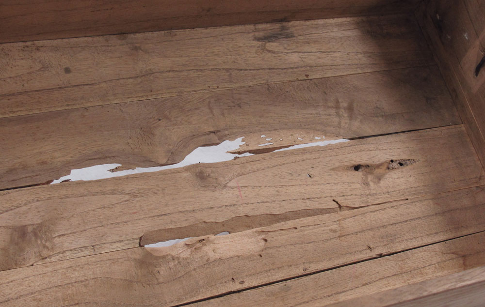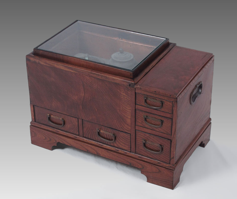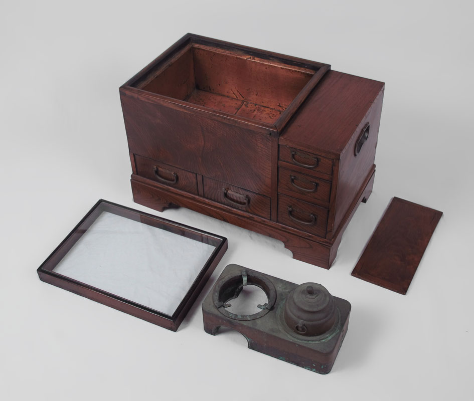 JAPANESE COPPER LINED WOOD HIBACHI: Copper lined basin over 2 drawers with 3 side drawers. Glass top over basin. Sold with metal cooker inside basin. 18 3/4'' h. x 26 3/4'' x 15 1/2''.