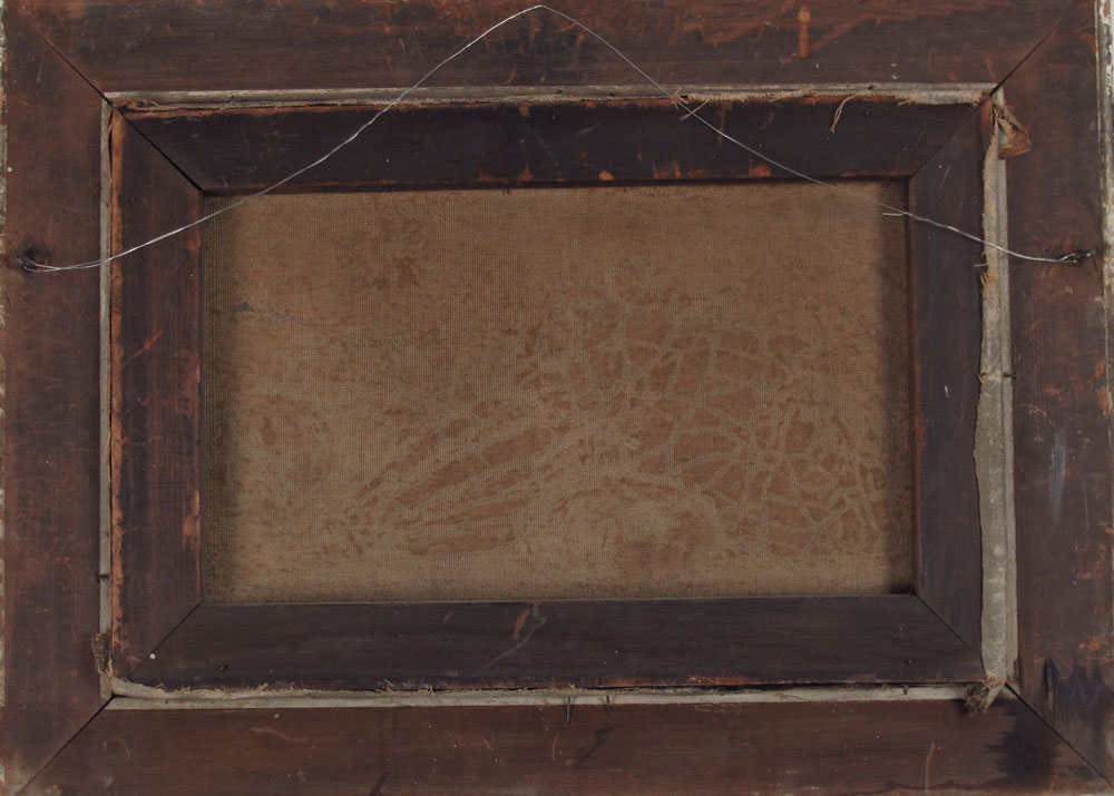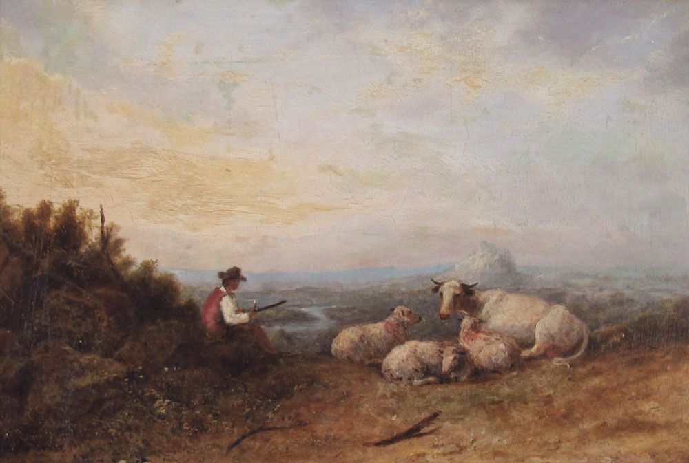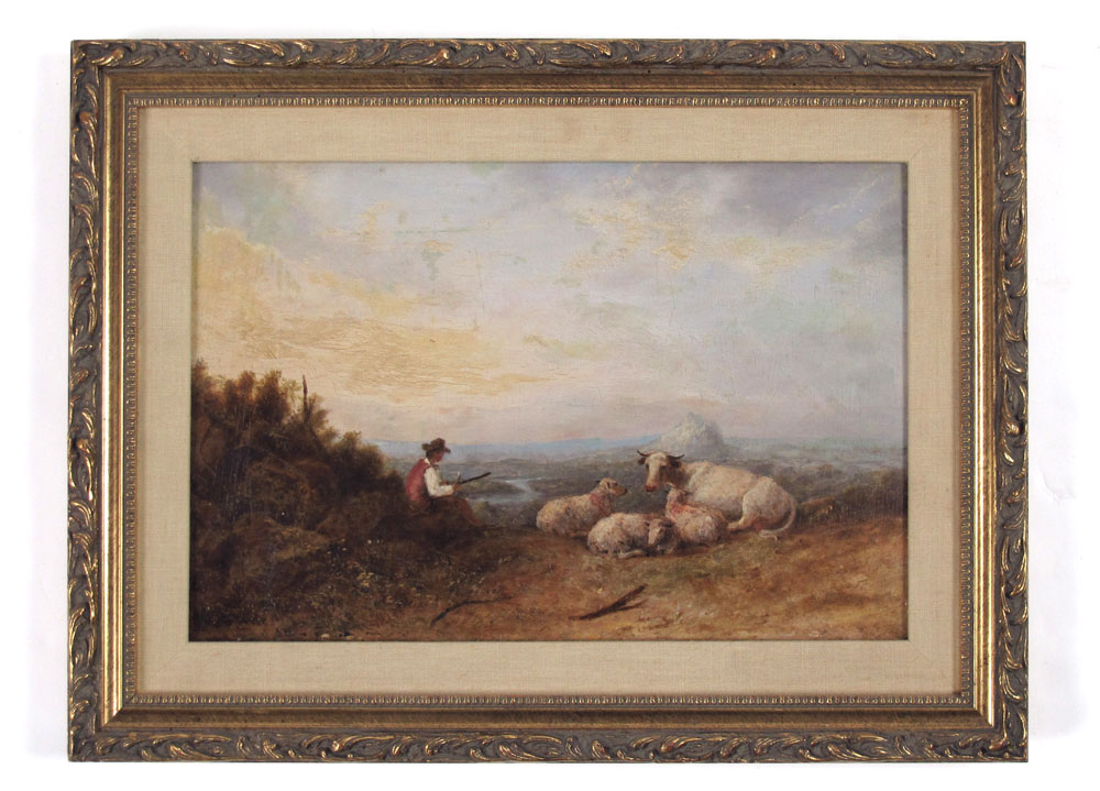 'MOUNT TOP STAFFORDSHIRE'' 19th C. PAINTING BY SAM SCARLETT: Depicts and shepherd with sheep and cow, relaxing, Oil/Wood Panel, 9 1/2'' x 14'', signed and titled verso, later frame 13 1/2'' x 18''.