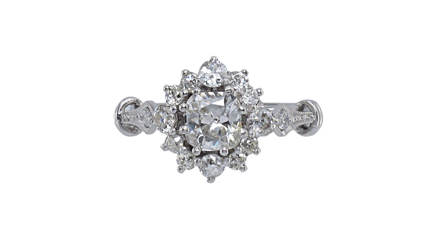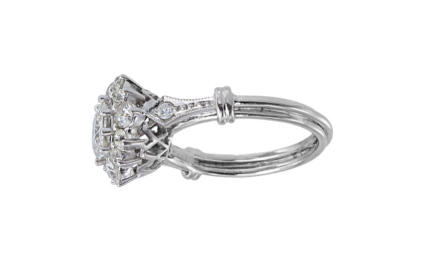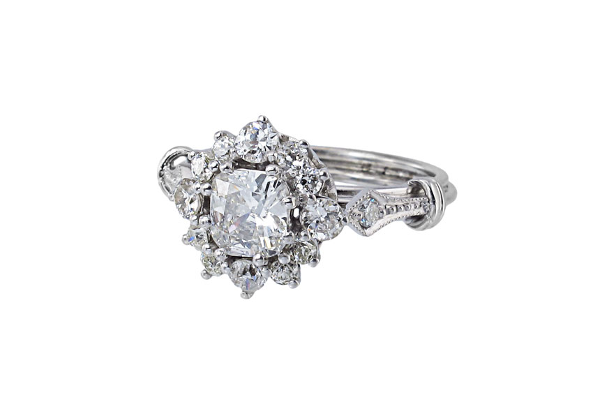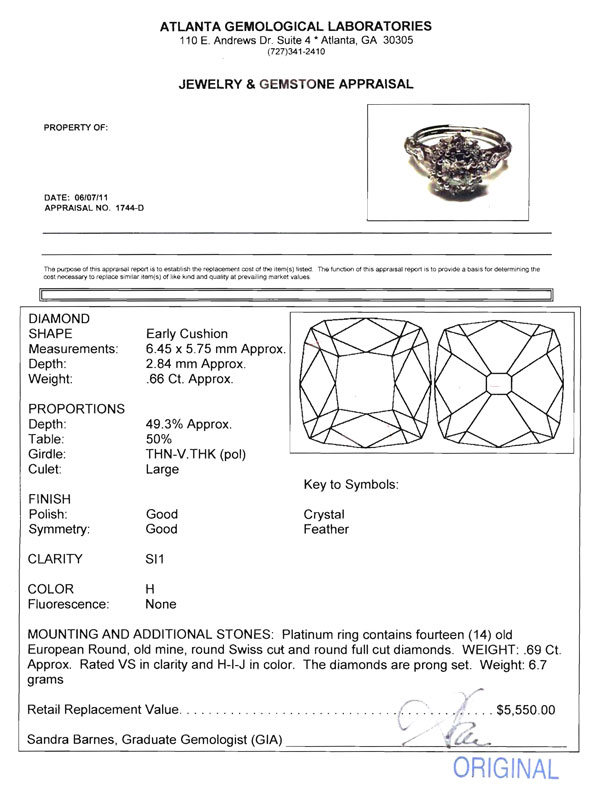 PLATINUM 1.35 CTW DIAMOND RING: Centering an approx. .66 Ct. Early cushion cut diamond of SI1 clarity and H color. This diamond is framed by an additional 14 old European round, old mine, round Swiss and round full cut diamonds, totaling approx. .69 Ct., averaging VS in clarity and H-I-J color. The diamonds are prong set, size 5.5. Weight 6.7 grams. Sold with current Atlanta Gemological's GIA graduates appraisal for $5,550.
