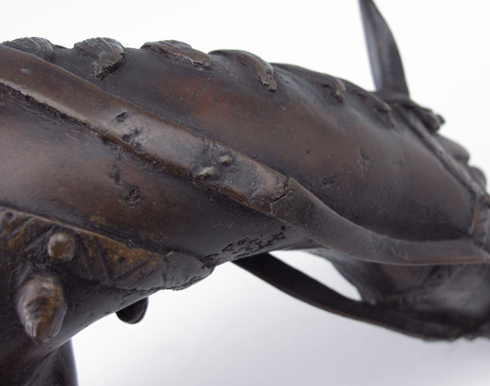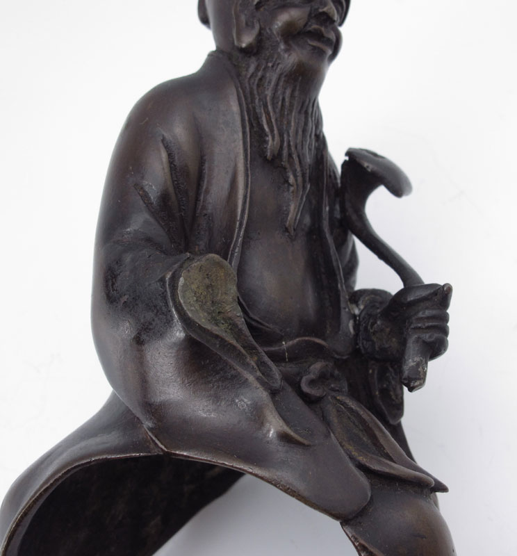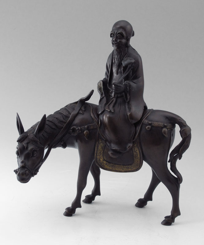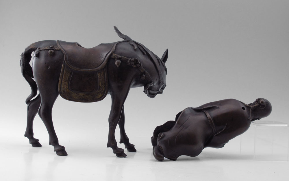 CHINESE BRONZE FIGURAL INCENSE BURNER: Depicts elderly man riding a donkey, 2 piece, 10'' h., 9'' w.
