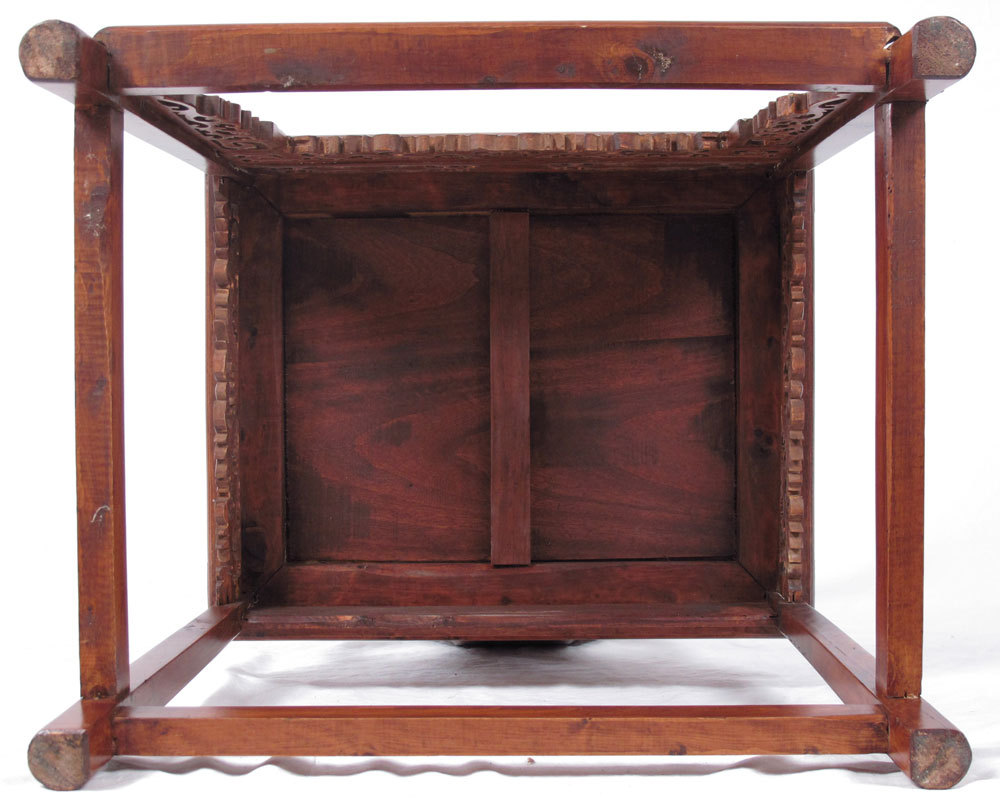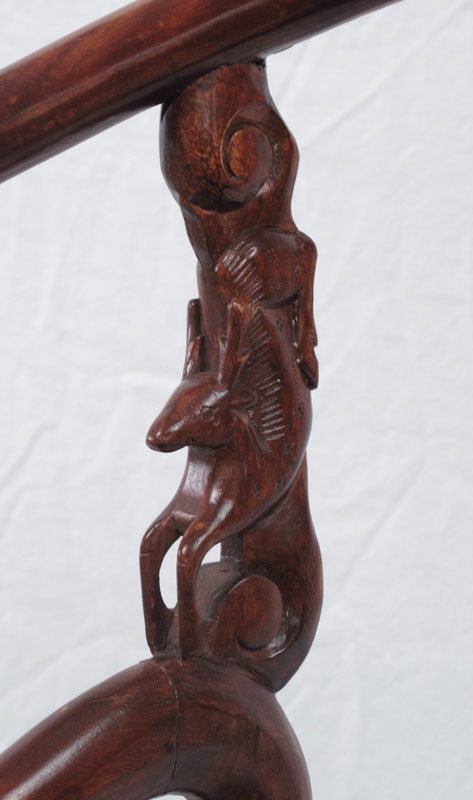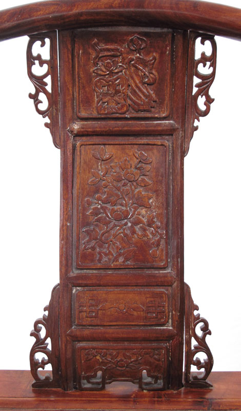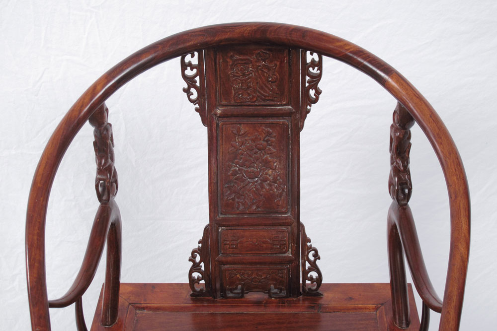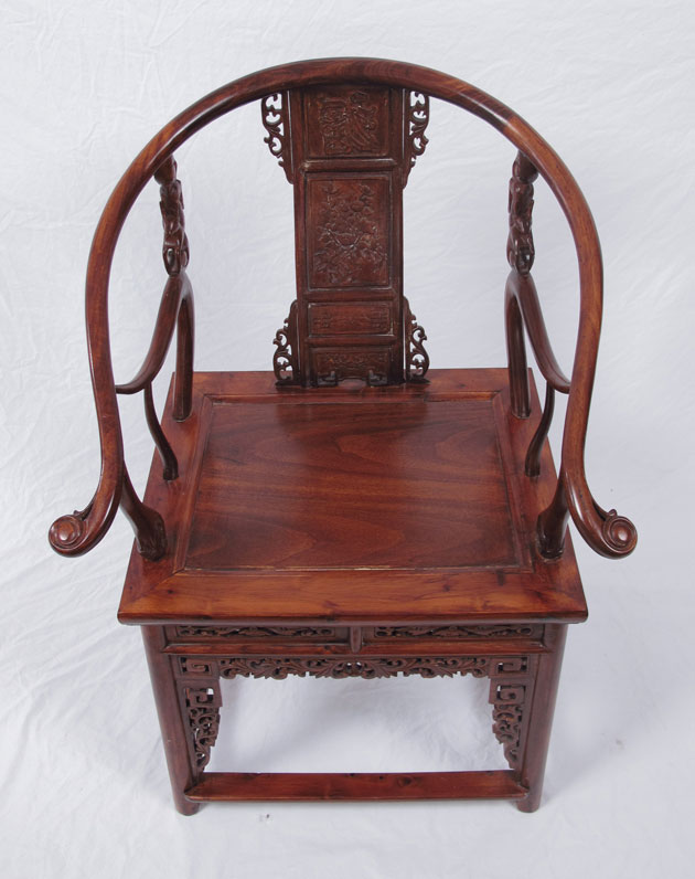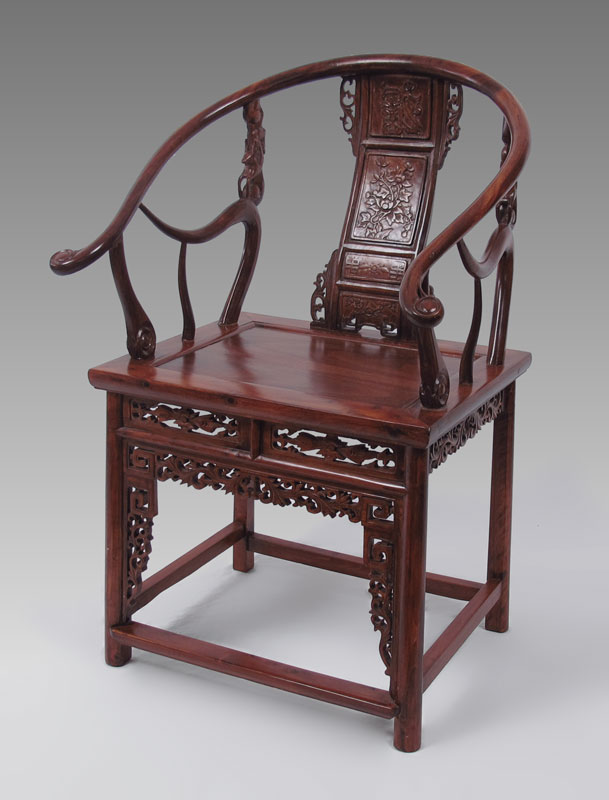 RICHLY CARVED ELMWOOD CHINESE HORSE SHOE BACK CHAIR: Carved and pierced designs including oriental motifs and figural deer arm supports. 34 3/4'' h. x 24 1/2'' x 24 1/2''.