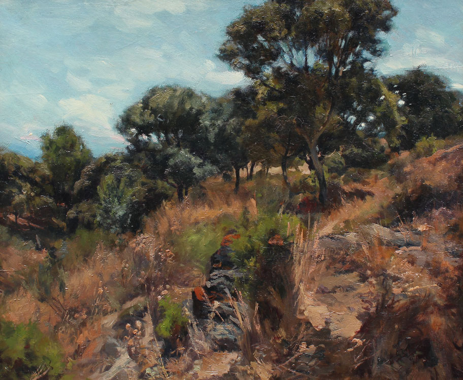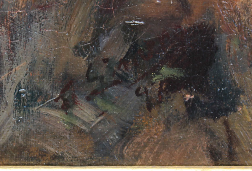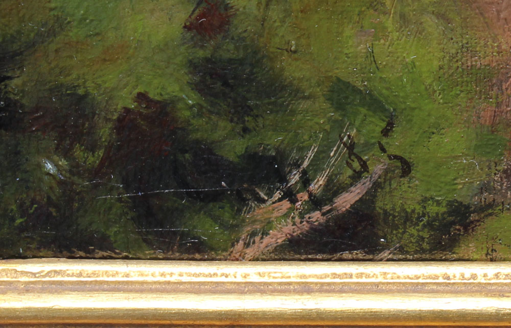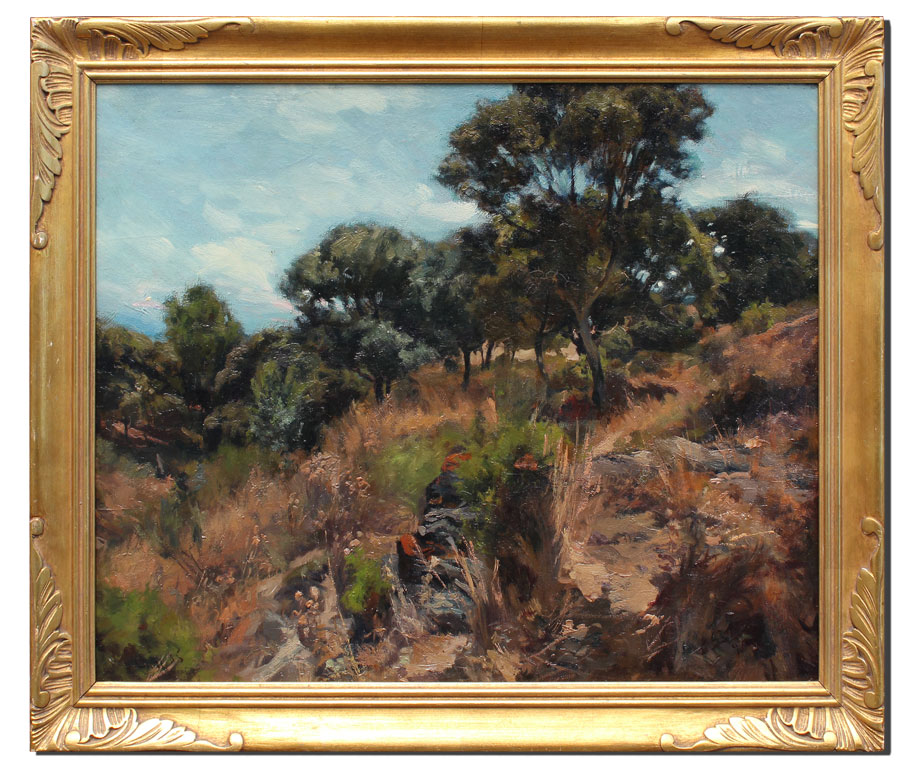ILLEGIBLY SIGNED 19TH C. IMPRESSIONIST HILLSIDE LANDSCAPE: Oil/Canvas Mounted on Board, hillside scene bearing 2 signatures, one reads 'Call?', dated '85, the other is indistinct and dated '97, 17 3/4'' x 22 1/2'', encased in later carved and gilded impressionist frame 21 1/4'' x 26''.