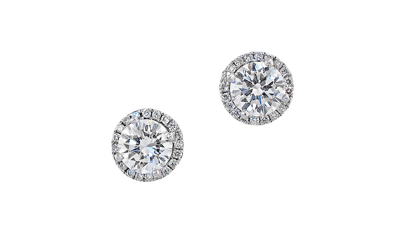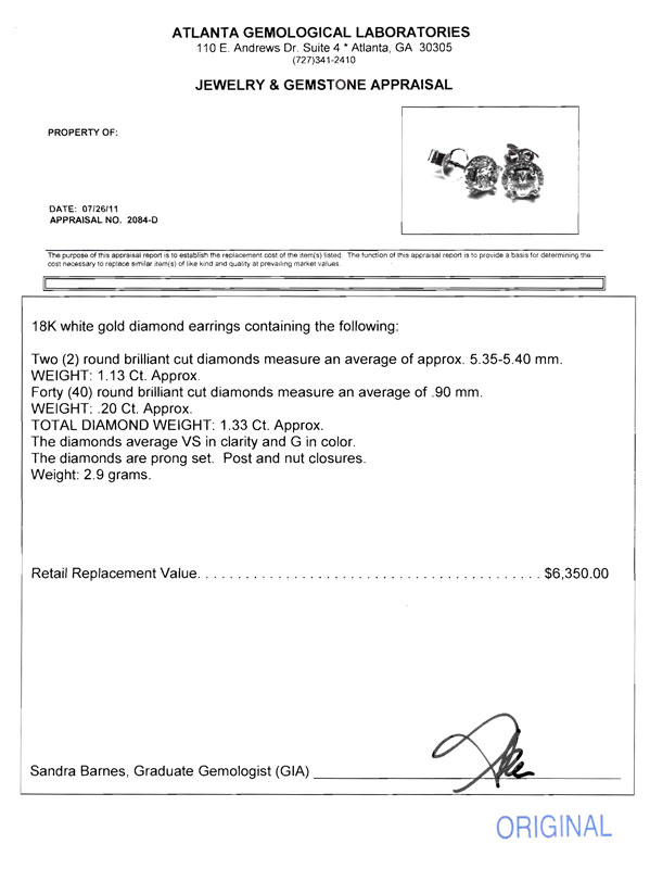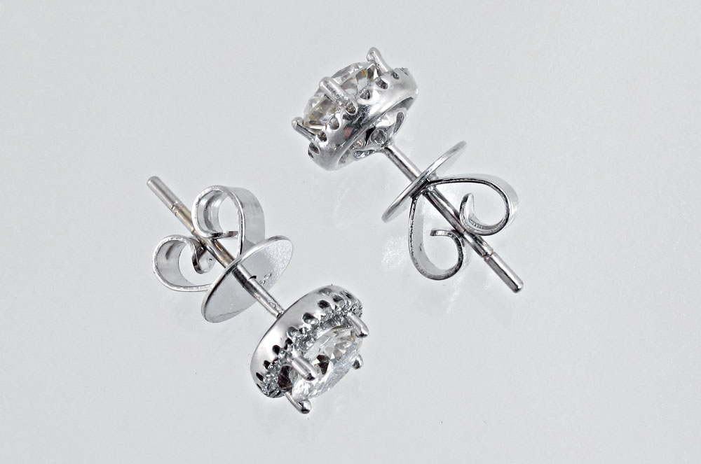 18K GOLD DIAMOND HALO STUD EARRINGS: 18K white gold earrings contain 2 round brilliant diamonds, approx. 1.13 Ct., surrounded by 40 round brilliant diamonds, approx. .20 Ct. The diamonds average VS in clarity and G in color. Prong set. Post and nut closures. Sold with current Atlanta Gemological GIA graduates appraisal for $6,350.