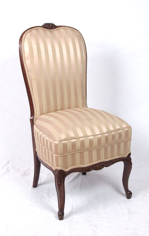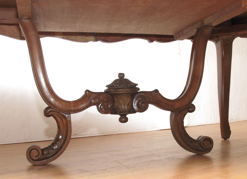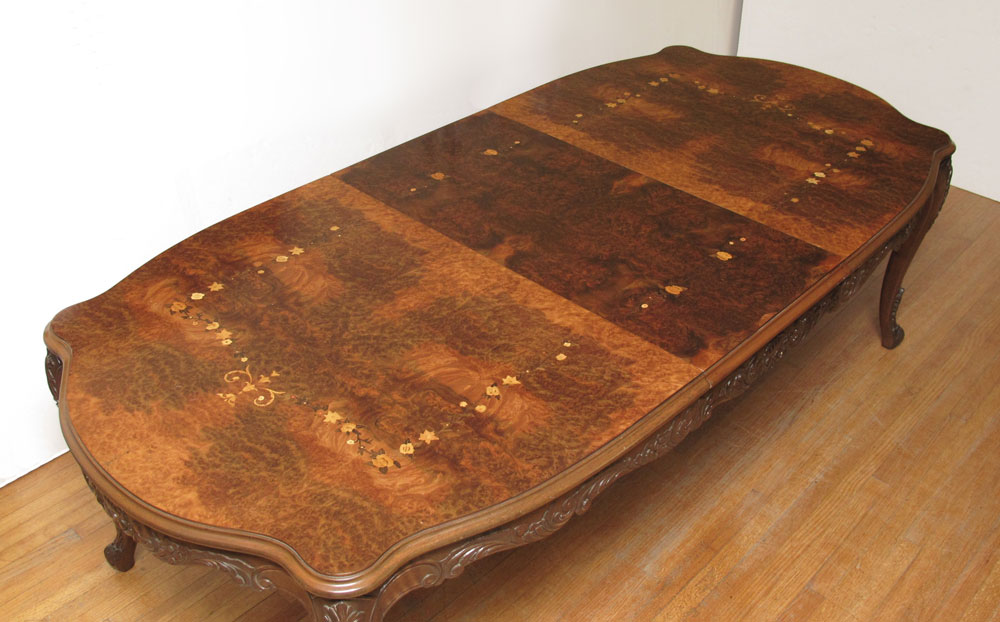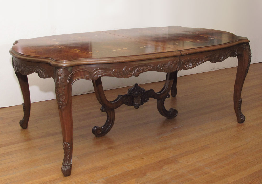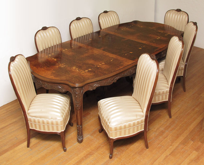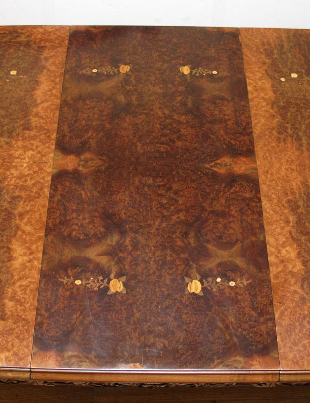 FRENCH MARQUETRY INLAY DINING TABLE AND 8 CHAIRS: A shaped and richly burled table with carved apron and legs. 31 1/2'' h. x 104 1/4'' long x 49'' fully expanded. Leaf 29'' wide. Sold with the 8 chairs.