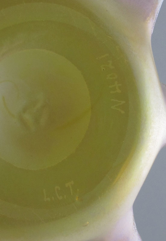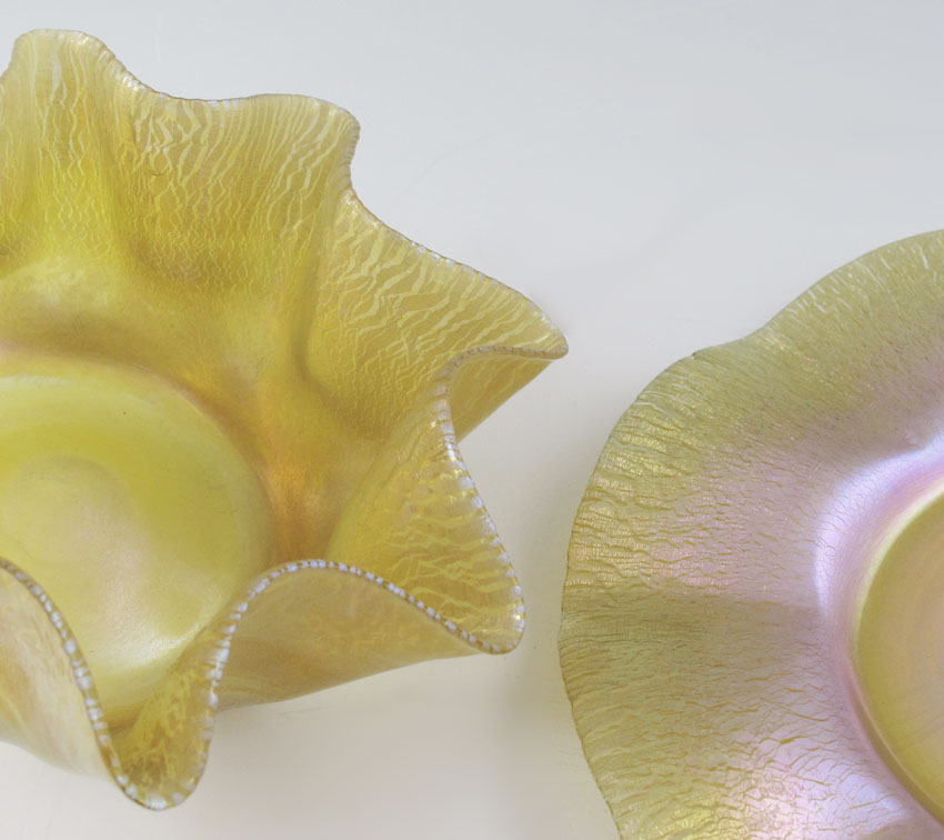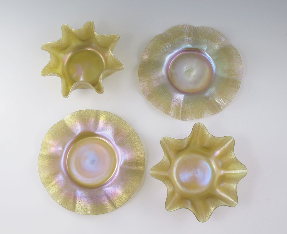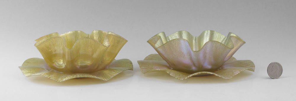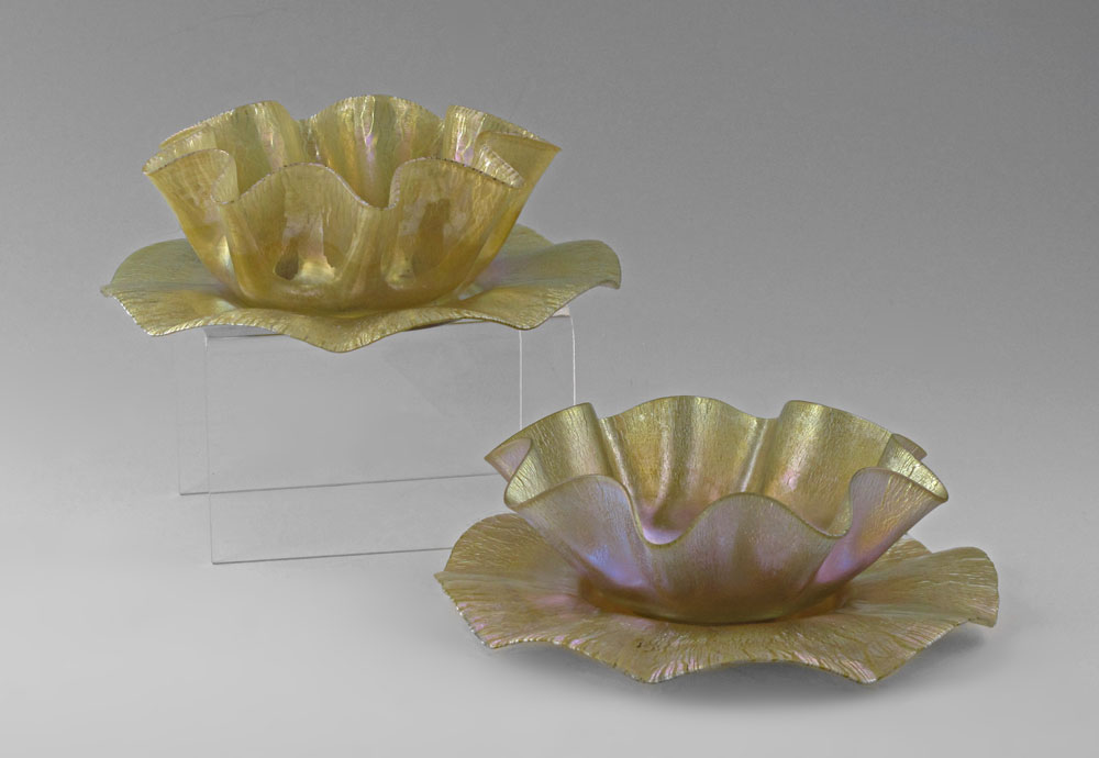 2 TIFFANY FAVRILE GLASS BOWLS AND UNDERPLATES: Scalloped rim bowls and underplates, approx. 6 and 6 3/4'' dia. Signed LCT and numbered N8807, N3986, N4021, and N8864.