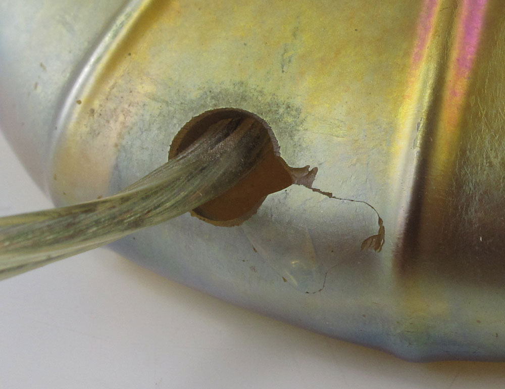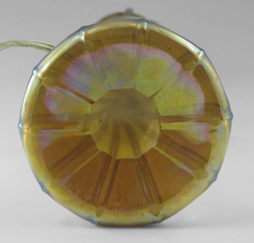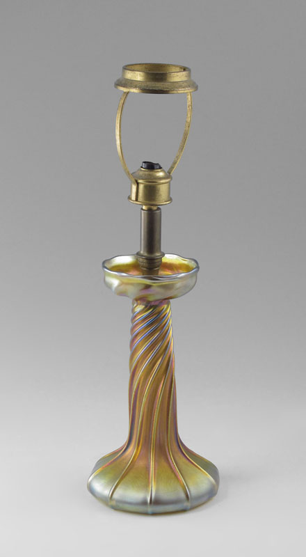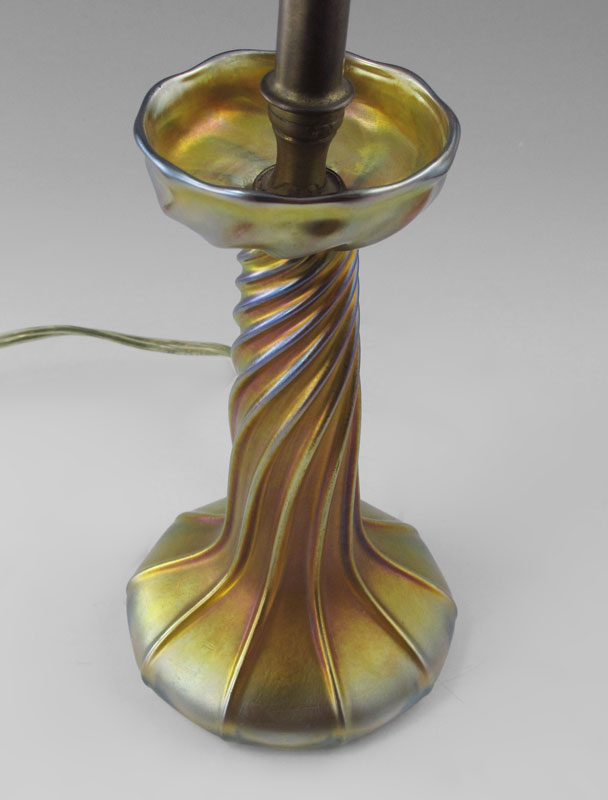 TIFFANY FAVRILE ART GLASS LAMP: Swirled design, signed L.C.T. Favrile. 13 1/2'' tall.