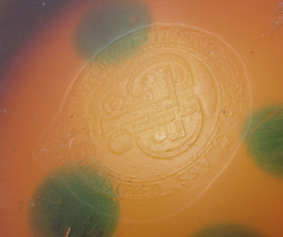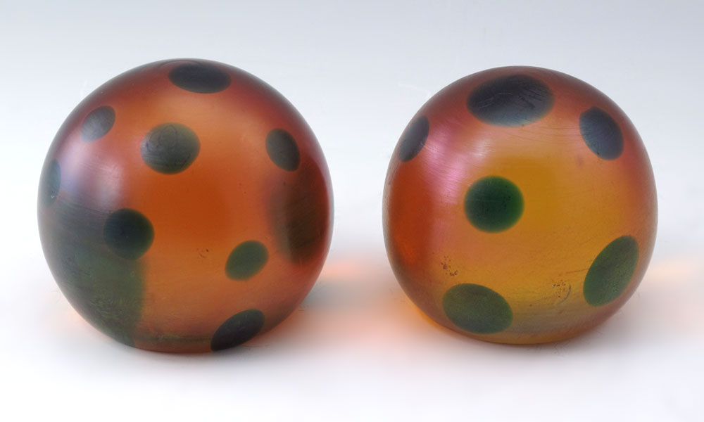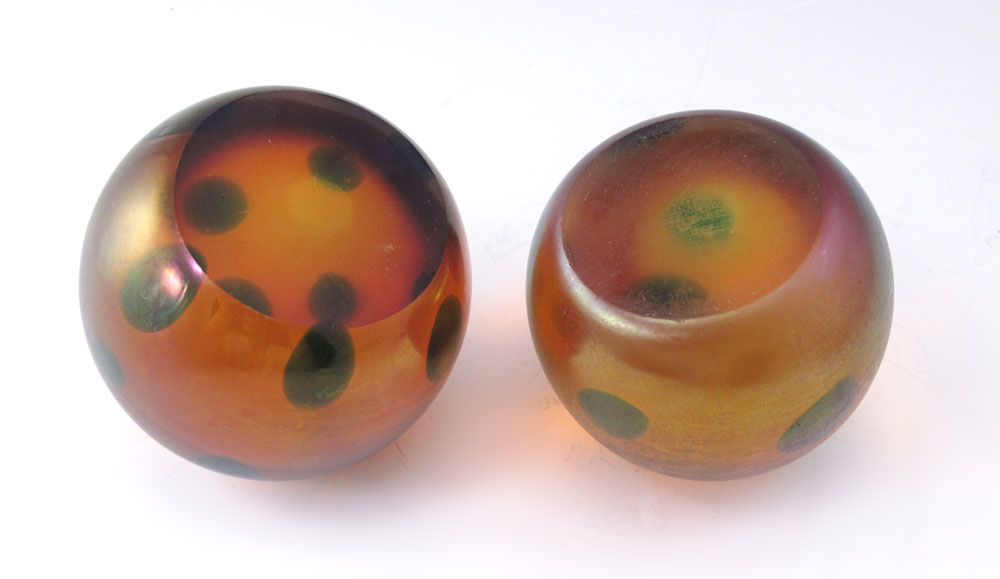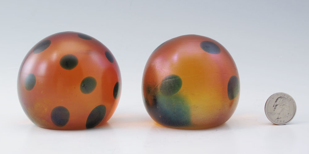 PAIR OF TIFFANY PAPERWEIGHTS: Amber color base with green coin dot decoration. Impressed Tiffany Favrile Glass Registered Trademark on one. 2 3/4'' h. x 3'' dia.