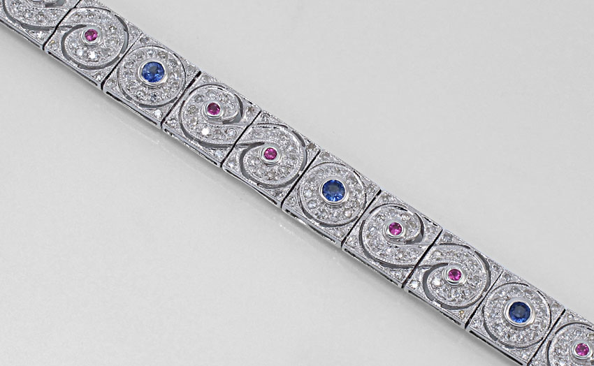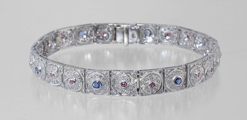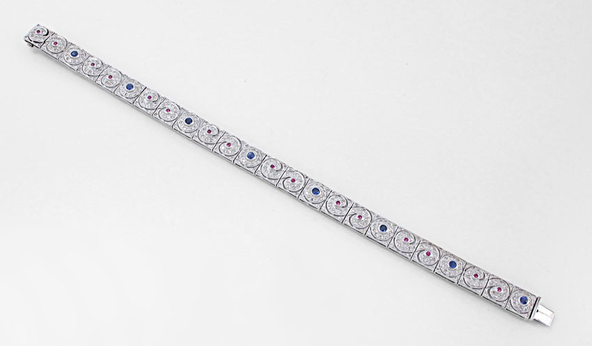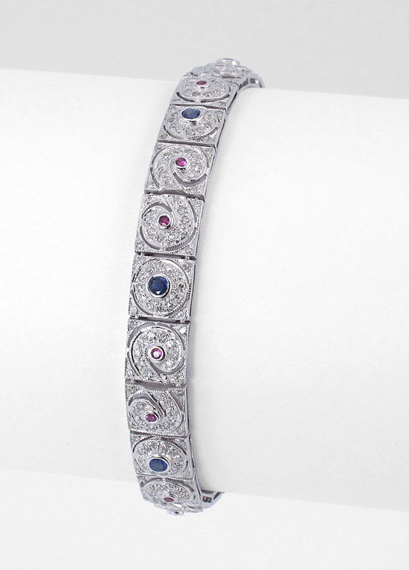 3 CTW DIAMOND, RUBY & SAPPHIRE BRACELET: 14K white gold bracelet contains 336 round single cut diamonds, approx. total weight 2.00 Ct. average VS-SI in clarity and H-I in color. 24 round mixed cut sapphires and rubies. Weight: 1.00 Ct. Approx. The diamonds are bead set. The sapphires and rubies are bezel set. Locking closure with hidden hinged safety clasp. Weight: 16.3 grams. Length: 7.5''