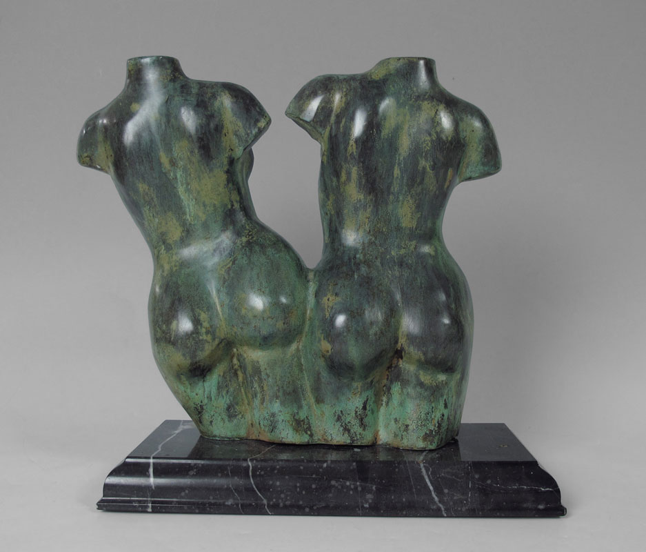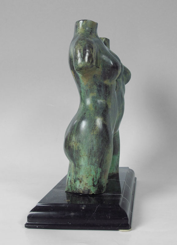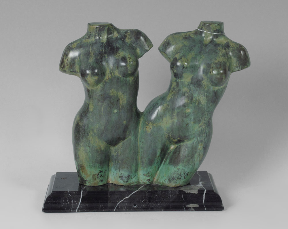 PATINATED BRONZE OF 2 FEMALE NUDE TORSOS: 14 1/2'' h., 17 1/2'' w., unsigned, affixed to beveled marble plinth.