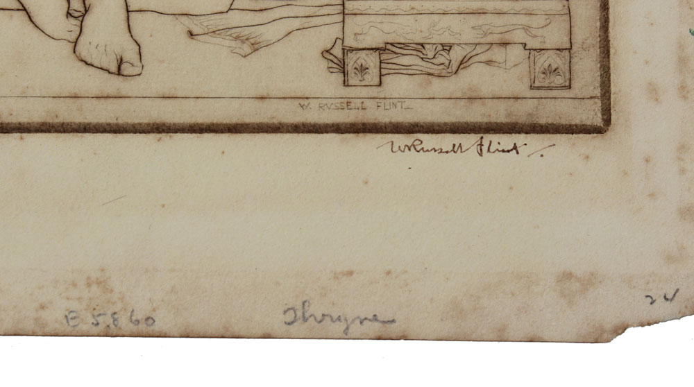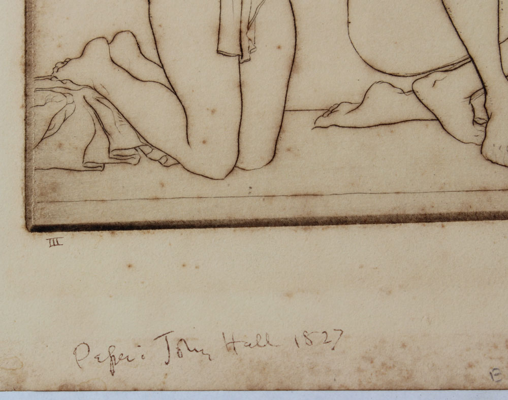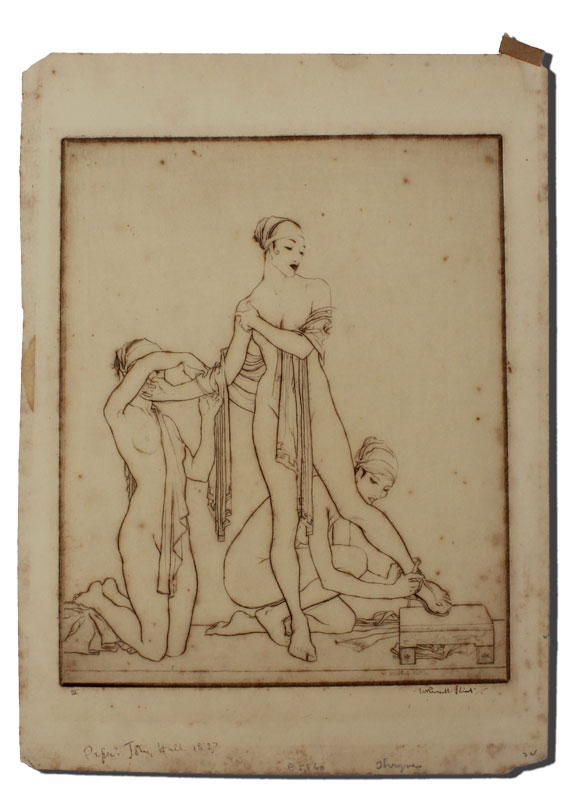FLINT, Sir William Russell, (Scottish, 1880-1969): ''Phryne'', depicts 3 nudes, 2 of them appear to be maids dressing their master, 9 1/4'' x 7 1/8'' with margins, signed lower right, numbered 3 lower left, titled in the lower margin, inscribed 'Paper: John Hall 1827', plate size 7'' x 6'', unframed.