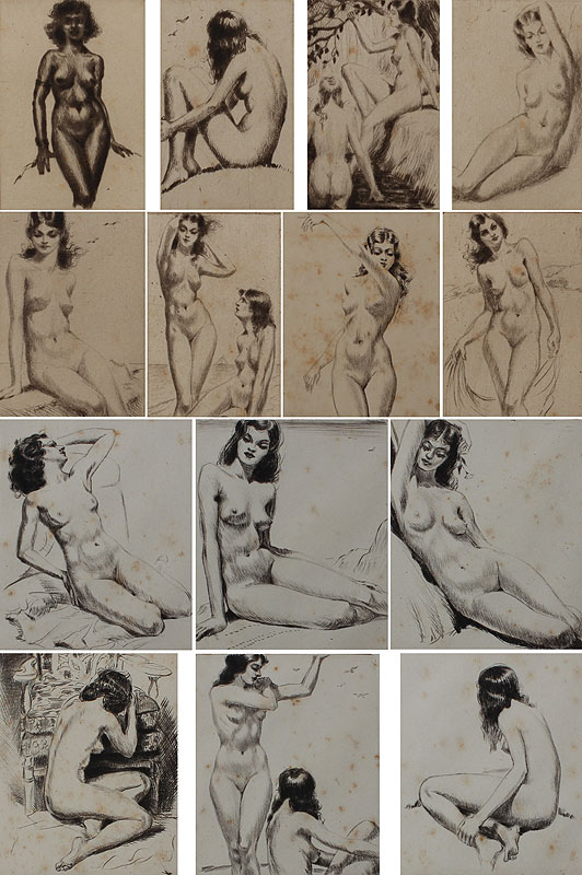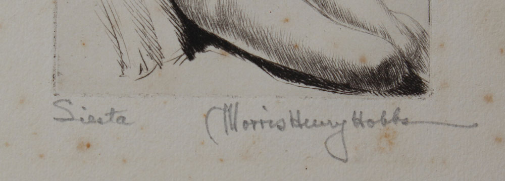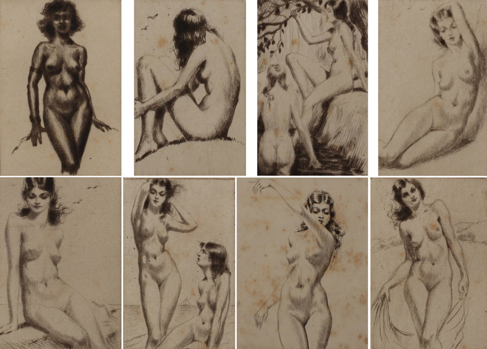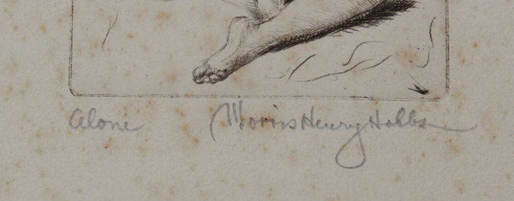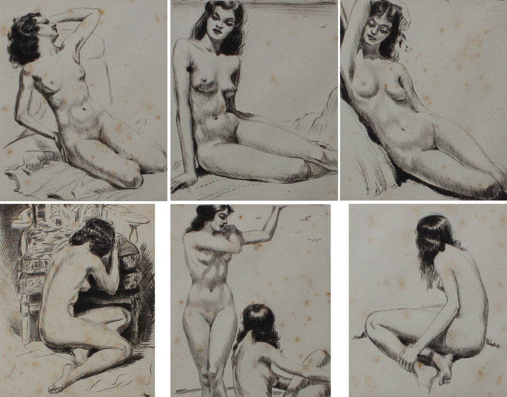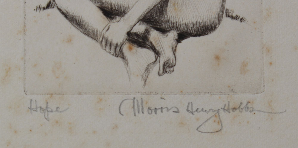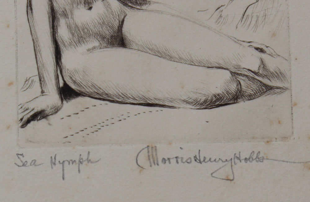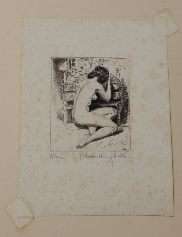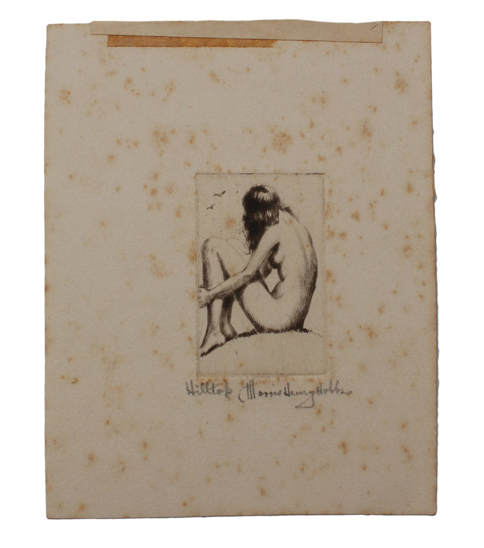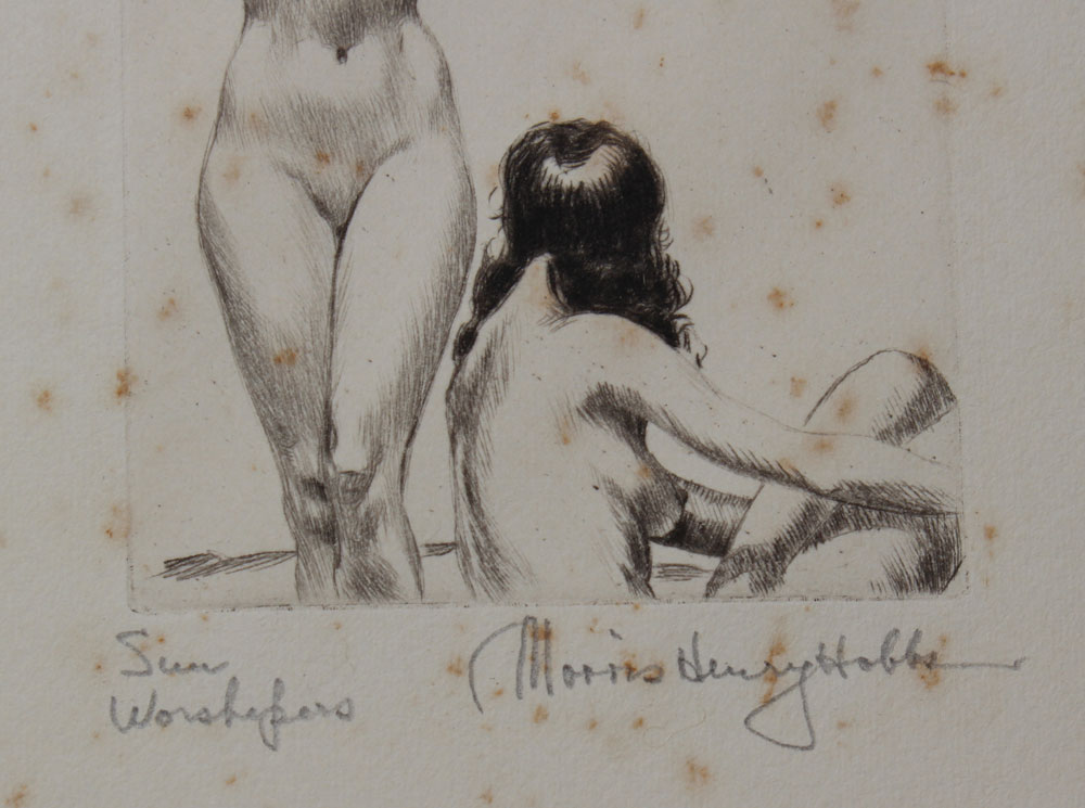 HOBBS, Morris Henry, (American, 1892-1967): 14 Piece Nude Etching Lot to include 1) ''Sun Worshippers'' 2) ''Sea Nymph'' 3) ''Alone'' 4) ''Hope'' 5) ''Dancer'' 6) ''Daydreams'' 7) ''Siesta'' 8) ''The Bathers'' 9) ''Sun Bather'' 10) ''Spring Dance'' 11) ''Hilltop'', 12) ''Susanne'', 13) ''Tahitian Girl'', 14) ''Wood Nymphs'' , last 7 are plate size @ 1 1/8'' x 1'', @ size with margins 3'' x 2 5/8'', remaining 7 are larger size prints that are tipped in mats, @ plate size 2 1/2'' x 2 1/4'', measure 5 3/4'' x 4 1/8'' with margins. All the larger sizes that are tipped are taped in upper right and lower left corners, all prints in this lot have scattered foxing throughout.