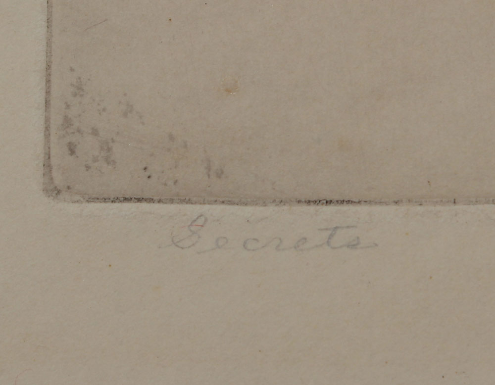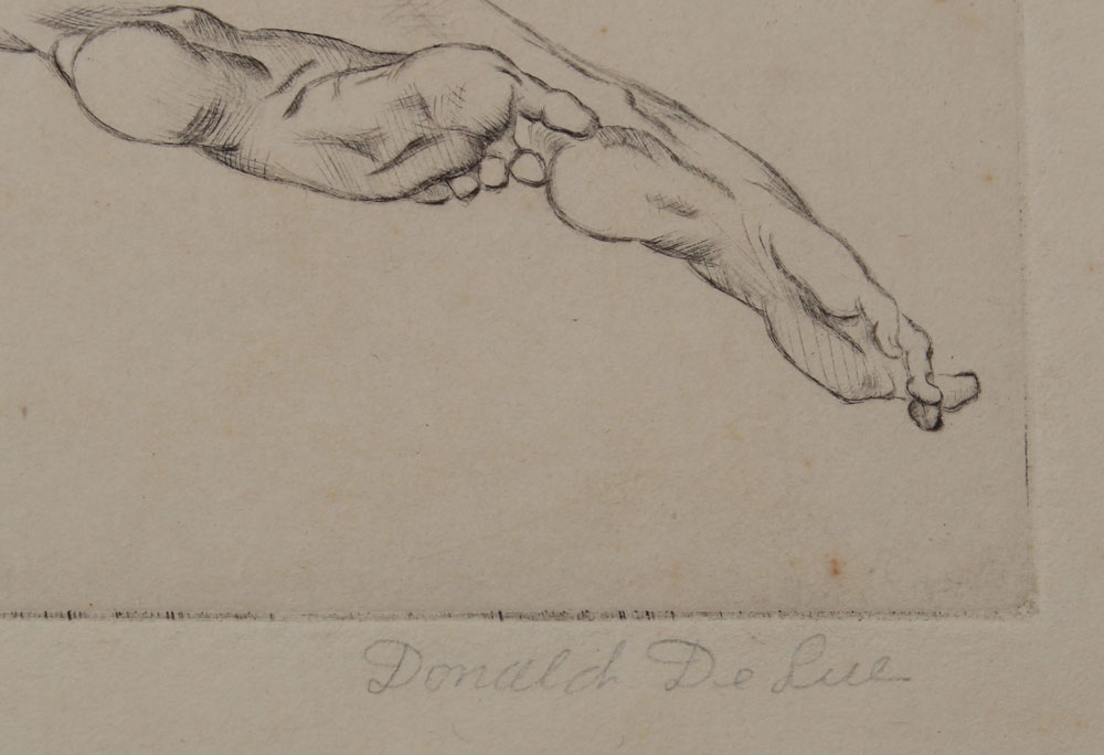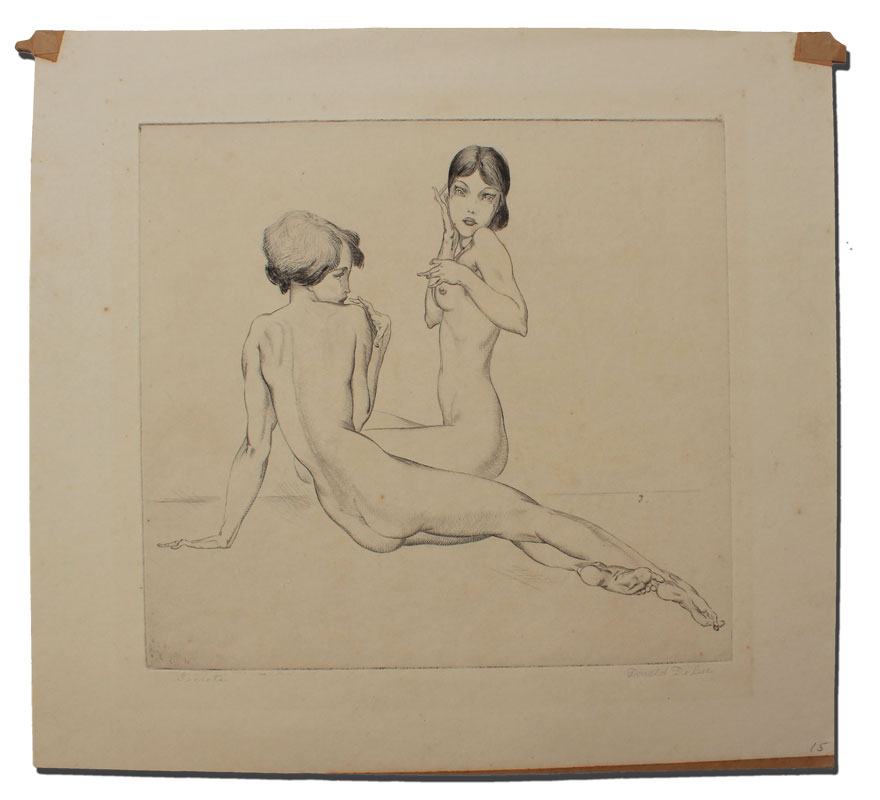 DE LUE, Donald, (American, 1900-1988): ''Secrets'', 2 female nudes, 10 3/4'' x 12 1/4'' with margins, pencil signed lower right, titled lower left, image size 7 3/4'' x 8 3/4'', unframed.) Donald Harcourt De Lue created, in a career spanning sixty years, more monumental sculpture than any other recent American artist, and is regarded as one of America's greatest monumental sculptors in the Realist style in the twentieth century. His works include: Rocket Thrower, executed for the New York World's Fair of 1964; The Spirit of American Youth, for the Omaha Beach Memorial, Normandy; Quest Eternal, at the Prudential Center in Boston; Washington at Prayer, at Valley Forge, Pennsylvania; and three of the monuments at the Gettysburg Battlefield. An accomplished draftsman, De Lue also created an extensive portfolio of designs on paper (over 2,000 in total) that inspired or related directly to his three-dimensional works, as well as a limited number of drypoint prints between the years 1933 and 1934. He studied at the Boston Museum of Fine Arts and later served as an assistant to sculptors Richard Recchia and Robert P.Baker. De Lue was president of the National Sculpture Society (1945-1947), a Guggenheim fellow (1943-1944), and in 1964 received the Harry Herring Medal and Golden Plate Award from the National Sculpture Society and National academy of Achievement, respectively. (CHILDS GALLERY)