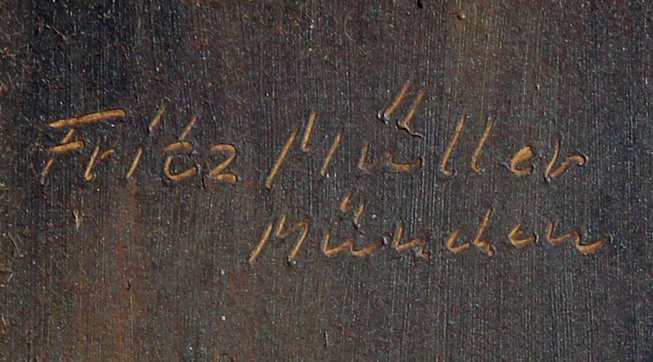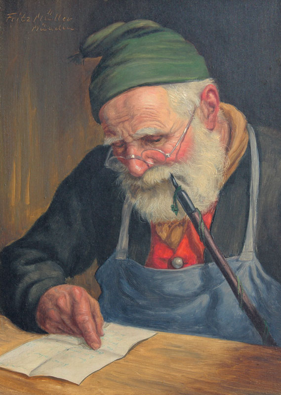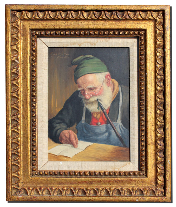 MULLER, Fritz, (German, 1901-): Bearded Man Reading and Smoking a Pipe, Oil/Board, 9 1/2'' x 7'', signed upper left 'Munchen', carved and gilded frame with minor wear, 15'' x 12 1/2''.