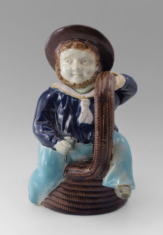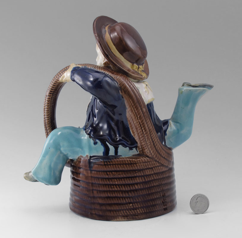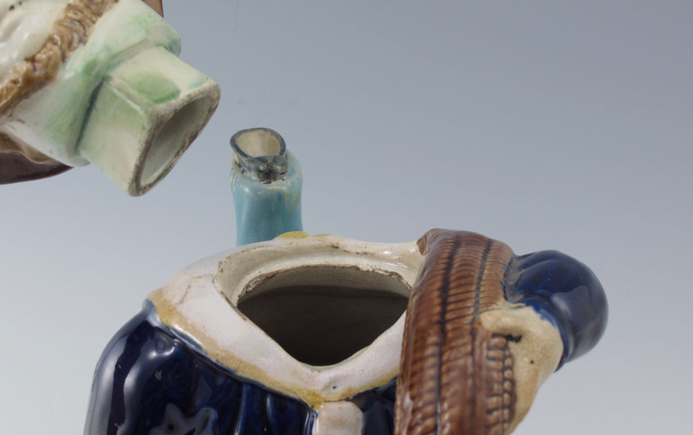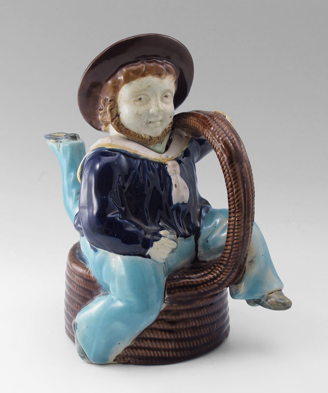 MAJOLICA ISLE OF MAN THREE LEGGED SAILOR TEAPOT: William Brownfield & Sons, Staffordshire. Marked for the retailer W. Broughton Douglas China Room 50 Duke St. 9 1/2' X 10 1/2''.