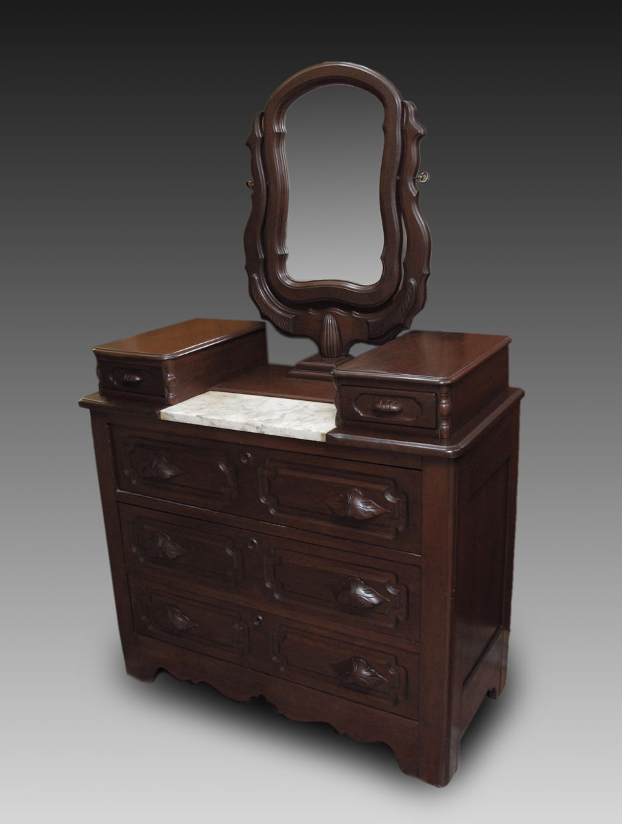 VICTORIAN MARBLE TOP DROP CENTER DRESSER: Pivot mirror, 2 glove drawers over 3 full length drawers, carved wood pulls. Measures 65'' tall x 40'' x 19'' overall.